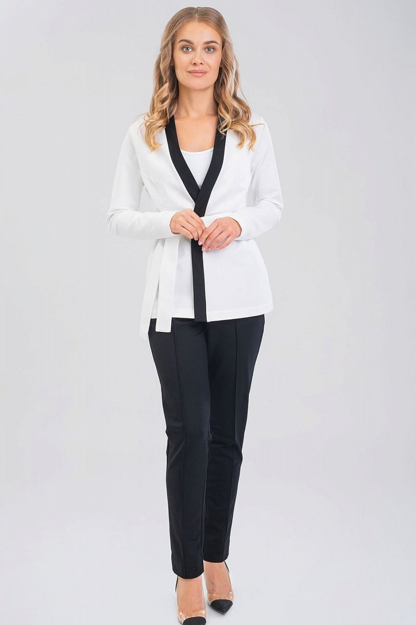Уютный трикотажный костюм. Свободный жакет без застежки, по борту контрастная планка, подвязан поясом.