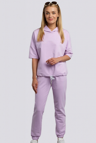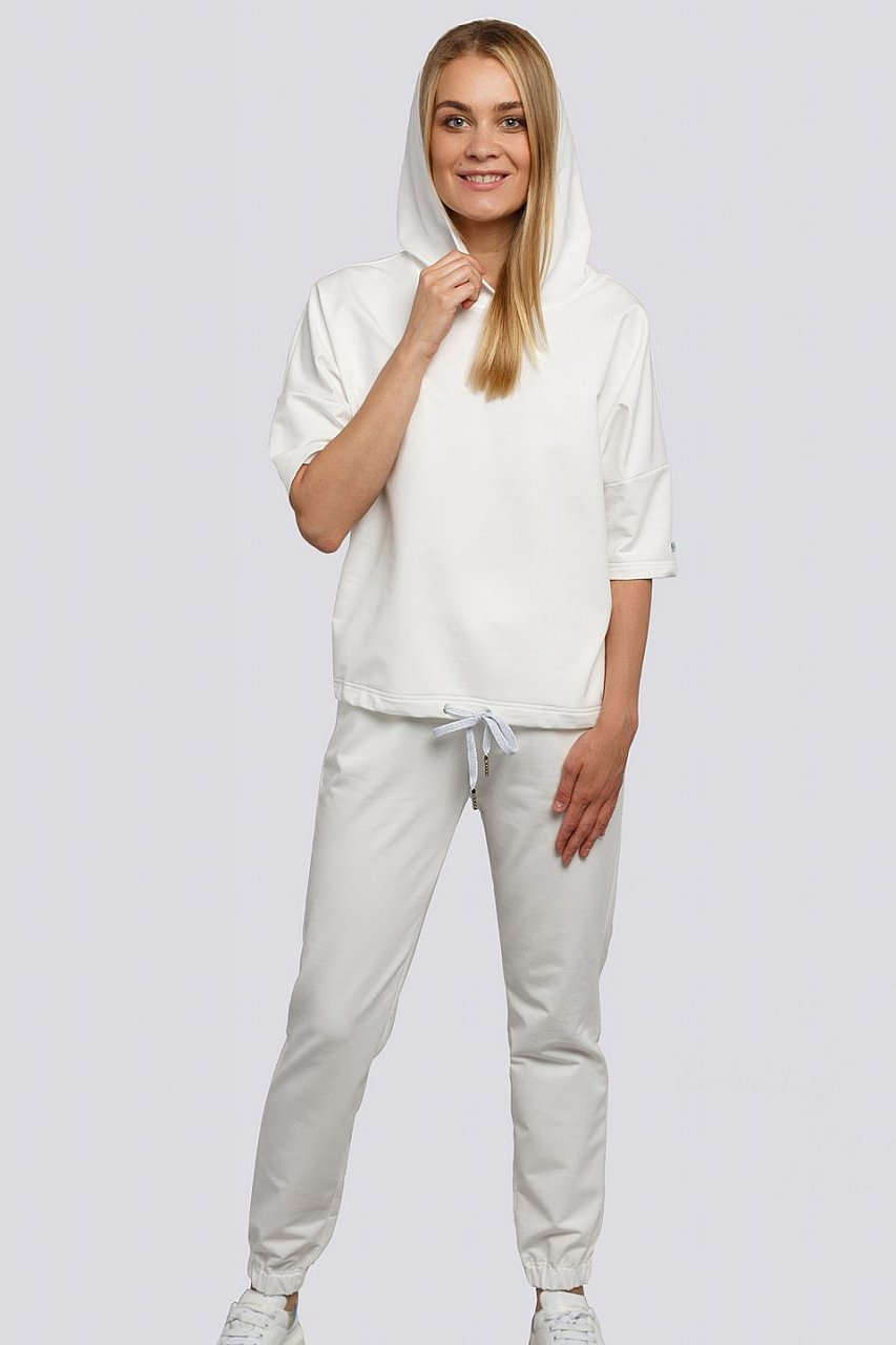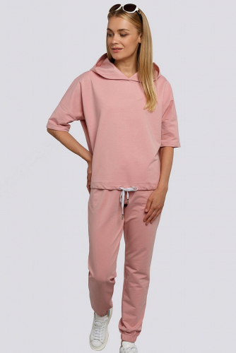 Спортивные костюмы стали чуть ли не главным предметом гардероба. И модницы, и дизайнеры оценили и настолько полюбили их, что теперь не готовы с ними расстаться и за пределами дома. Костюм состоит из худи с коротким рукавом и брюк. Худи «оверсайз» с капюшоном, рукав короткий, по низу кулиса со шнуром. Брюки свободные, пояс и низ брюк на резинке. Состав трикотажа: 75% хлопок, 20% полиэстер, 5% спандекс.