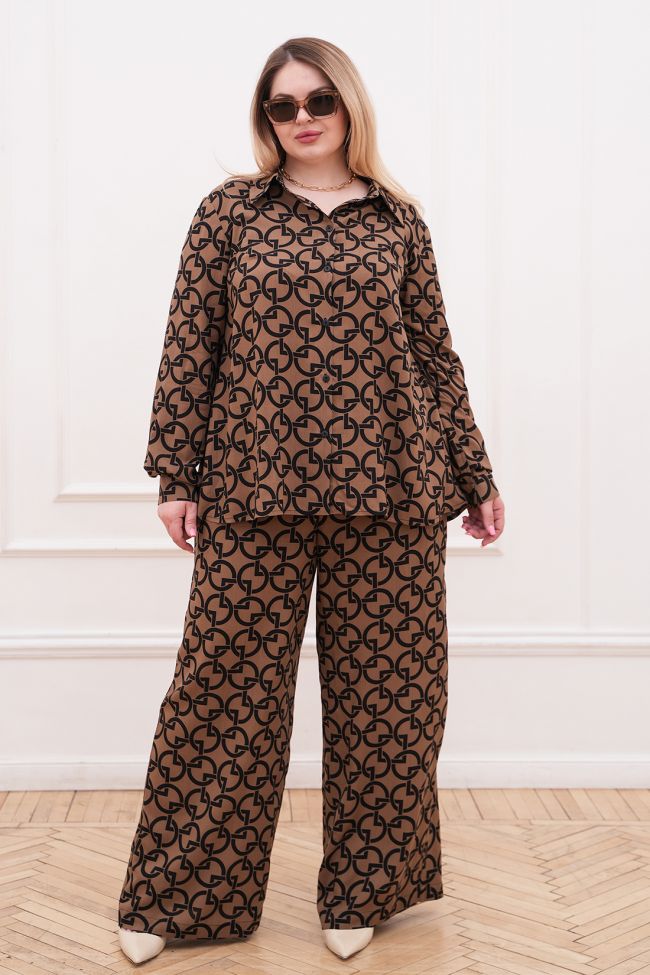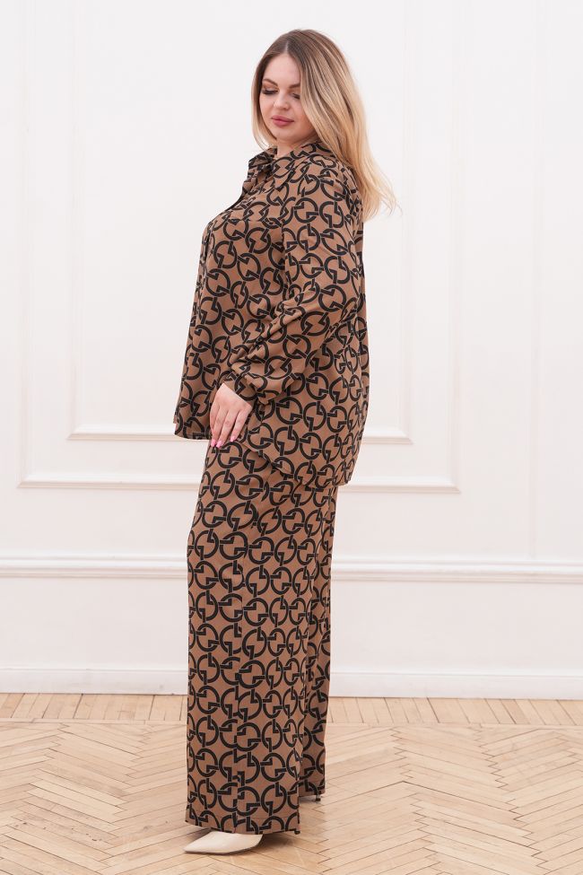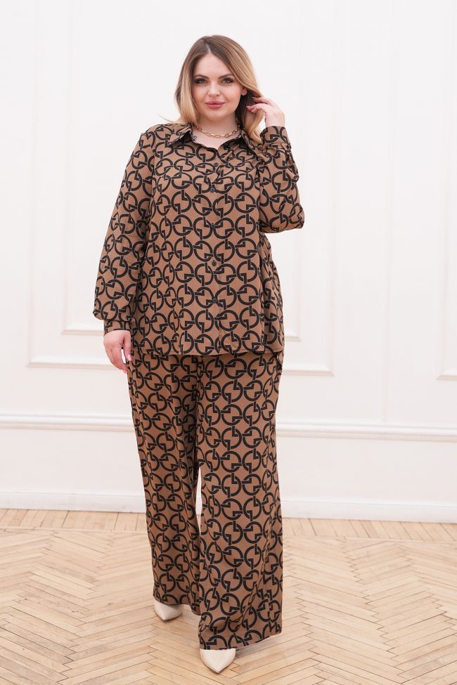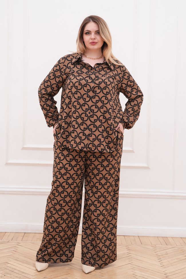 коричневый Стильный костюм из штапеля, состоит из рубашки и брюк. Рубашка прямого силуэта. Воротник - рубашечного типа, по переду центральная застежка на петли и пуговицы.  Линия плеча спущеная. Рукав длинный, по низу дополнен манжетой с застежкой на петлю и пуговицу. Низ ровный.  Брюки свободные прямого силуэта. Модель с комфортной высокой посадкой на талии. По переду удобные карманы с подрезным бочком. Пояс на широкой резине. Замечательный выбор для ценителей стиля и комфорта.