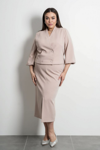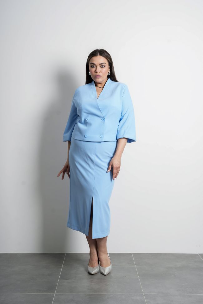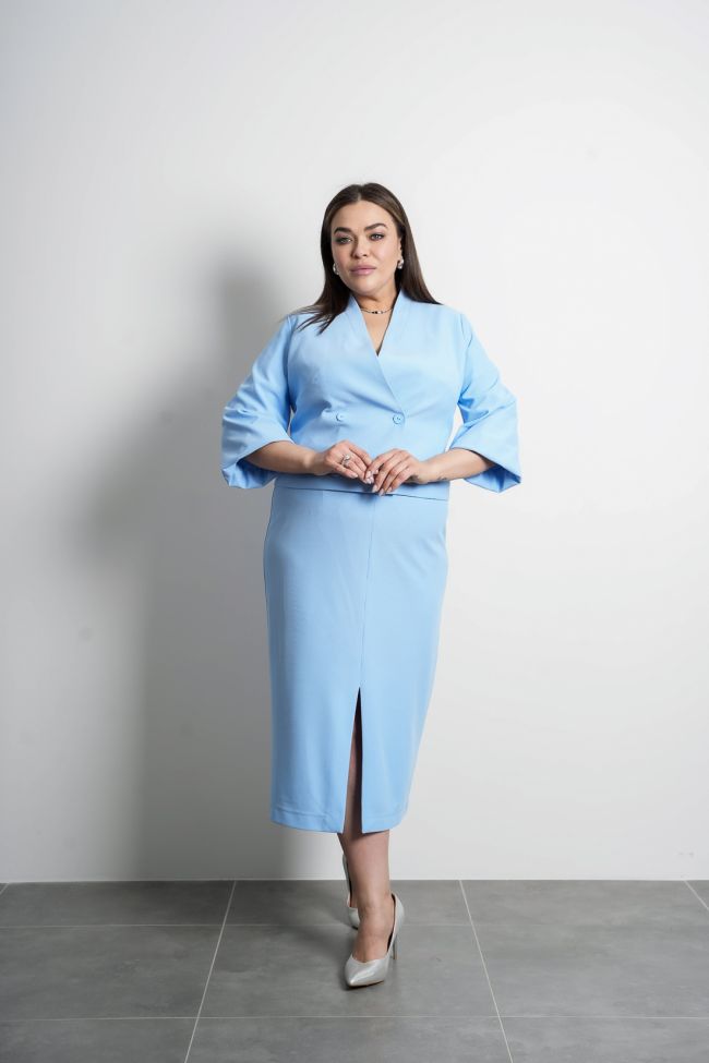 голубой Стильный костюм из трикотажа "Диор", состоит из жакета и юбки.  Жакет на подкладе, полуприлегающего силуэта, длиной веше линии бедра. Прилегание по фигуре за счет рельефов по переду и спинке. Застежка жакета смещенная на две пуговицы. Горловина V-образная с небольшой стойкой зрительно удлиняет шею. Рукава втачные, к низу расширены типа фонарик. Классическая юбка, в среднем шве заднего полотнища тесьма - молния. По центральному шву переда - разрез. Пояс комбинированный, с застежкой на петлю и пуговицу. Прекрасный вариант для создания как делового, так и повседневного образа.