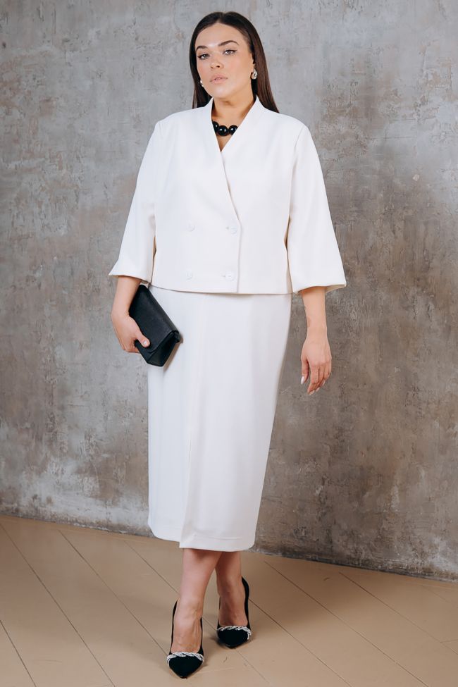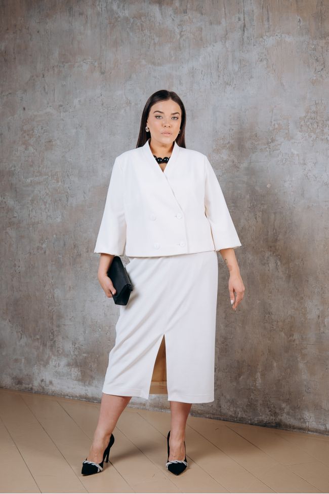 молочный Стильный костюм из трикотажа "Диор", состоит из жакета и юбки.  Жакет на подкладе, полуприлегающего силуэта, длиной веше линии бедра. Прилегание по фигуре за счет рельефов по переду и спинке. Застежка жакета смещенная на две пуговицы. Горловина V-образная с небольшой стойкой зрительно удлиняет шею. Рукава втачные, к низу расширены типа фонарик. Классическая юбка, в среднем шве заднего полотнища тесьма - молния. По центральному шву переда - разрез. Пояс комбинированный, с застежкой на петлю и пуговицу. Прекрасный вариант для создания как делового, так и повседневного образа.