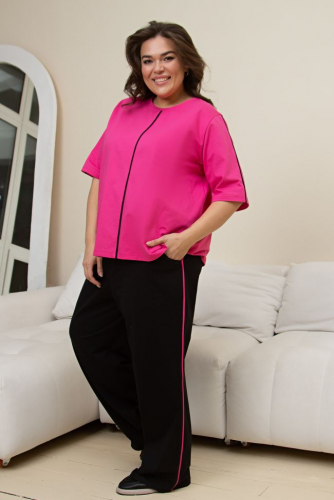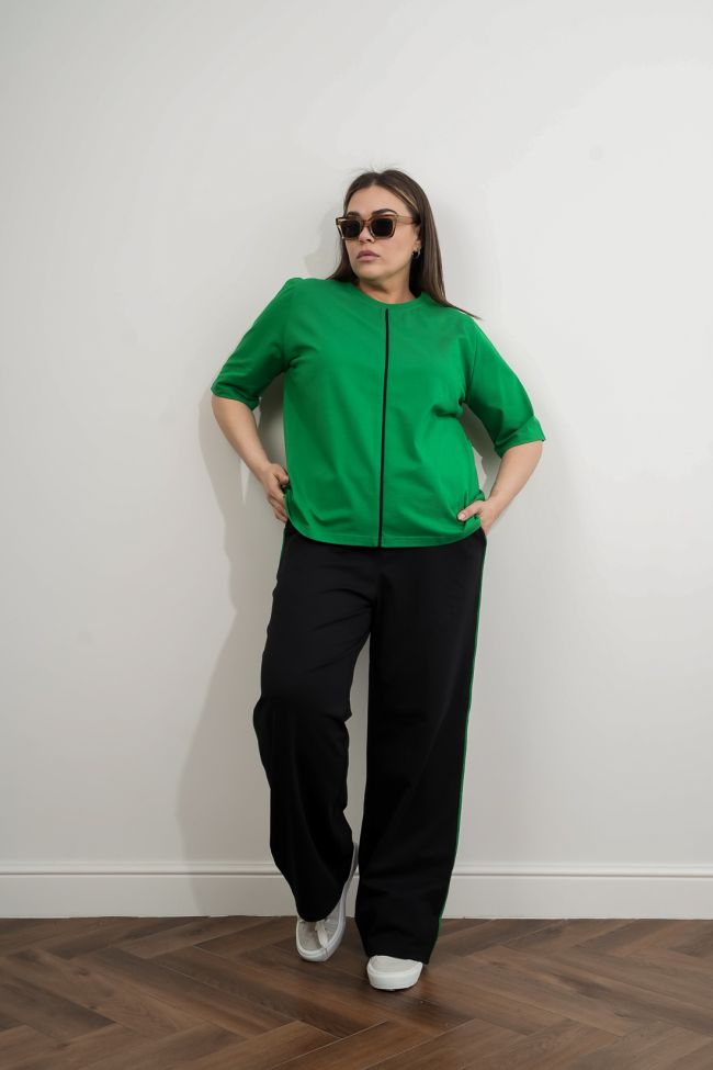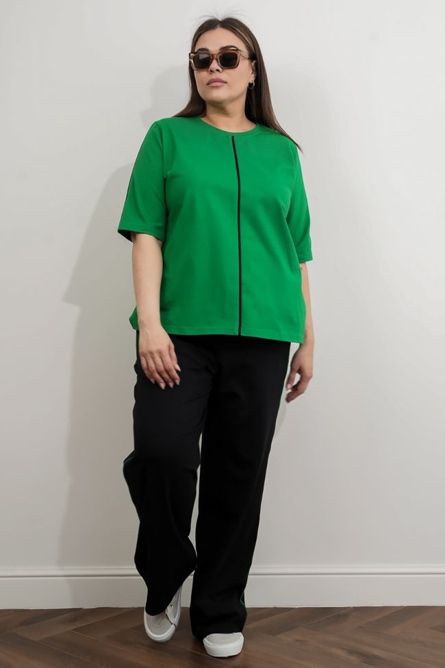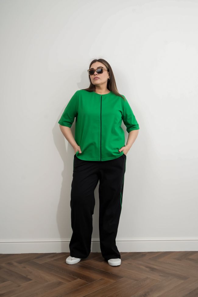 зеленый Стильный костюм состоящий из джемпера и брюк из плотного однотонного трикотажа. Джемпер прямого силуэта, круглый вырез горловины оформлен бейкой. Рукава длиной до локотя на спущенной линией плеча. По переду джемпера декоративная отделка в виде трикотажной ленты в тон брюкам. Низ ровный. Брюки прямого силуэта . Модель с комфортной высокой посадкой на талии, без застежки. Верх оформлен широким поясом на резинке. Передние половинки с удобными наклонными карманами. По бокам брюк декоративная тесьма в виде лампас в тон джемперу. Замечательный выбор для ценителей стиля и комфорта.