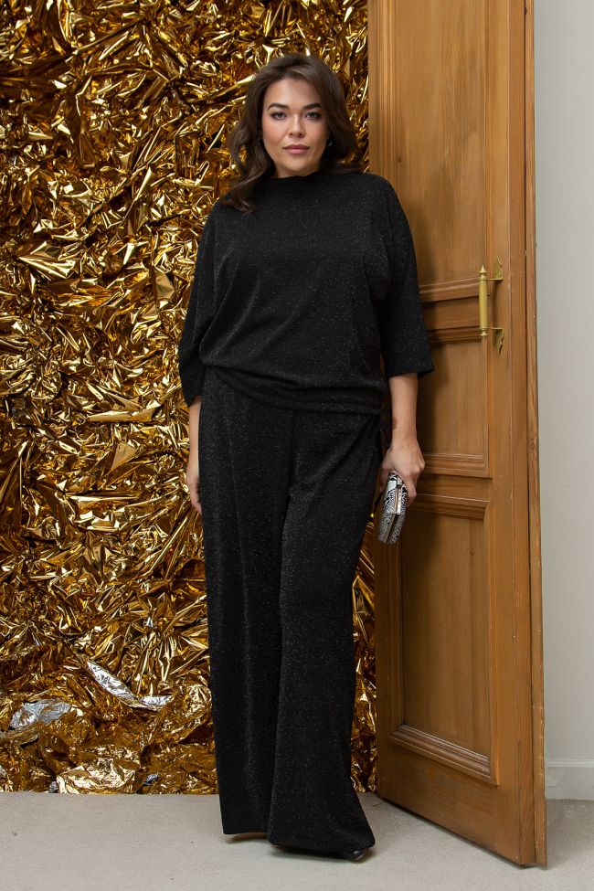 черный Стильный костюм из трикотажа "скуба" с напылением, состоит из джемпера и брюк. Джемпер свободного силуэта длиной до линии бедер. Круглый вырез горловины оформлен воротником "мягкая стойка". Цельнокроеные рукава длиной 3/4. Низ изделия оформлен кулиской.  Брюки прямого силуэта. Модель с комфортной высокой посадкой на талии. Верх с эластичным поясом. Прекрасный вариант для торжественных мероприятий.