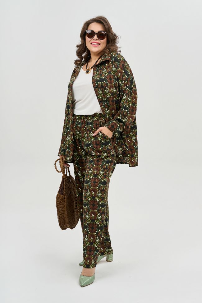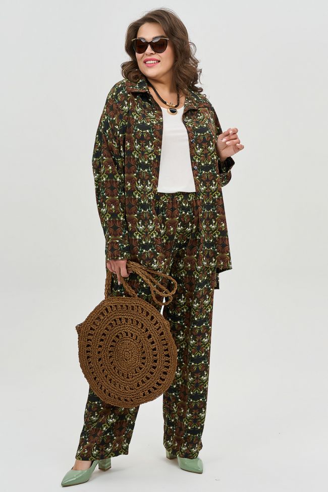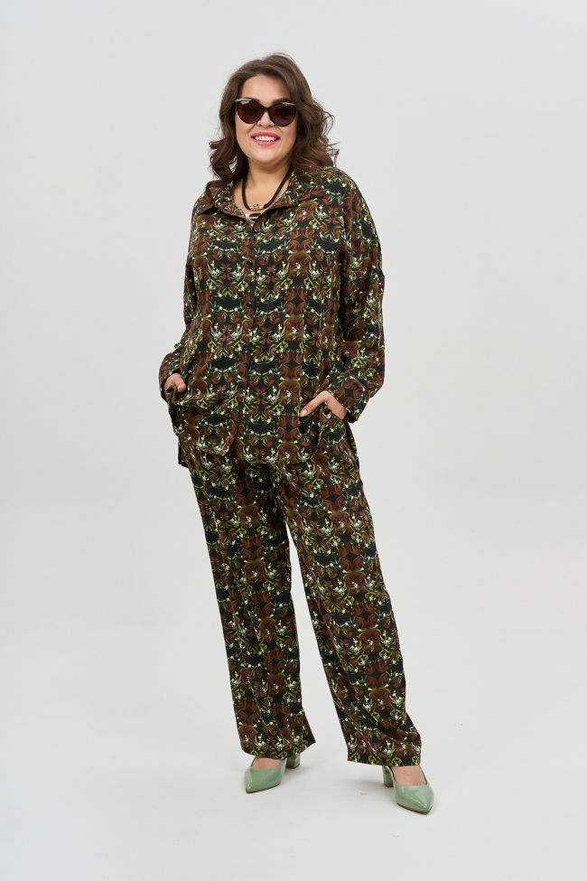 зеленый Стильный костюм из струящейся принтованной ткани, состоит из рубашки и брюк. Рубашка прямого силуэта. Воротник - рубашечного типа, по переду центральная застежка на петли и пуговицы.  Линия плеча спущеная. Рукав длинный, по низу дополнен манжетой с застежкой на петлю и пуговицу. Низ разноуровневый с удлиненной спинкой. Боковые швы дополнены разрезами. Брюки свободные прямого силуэта. Модель с комфортной высокой посадкой на талии. По переду удобные карманы с подрезным бочком. Пояс на широкой резине. Замечательный выбор для ценителей стиля и комфорта.