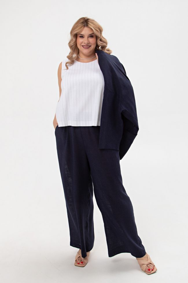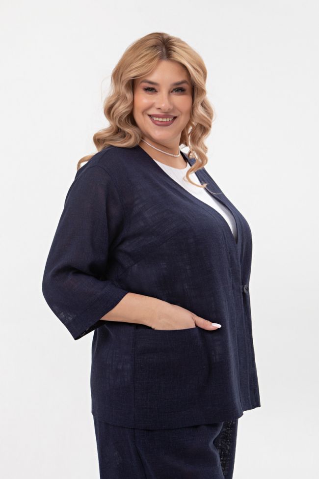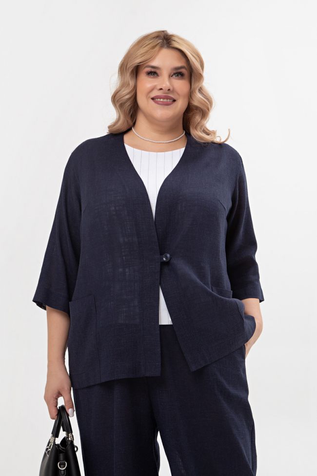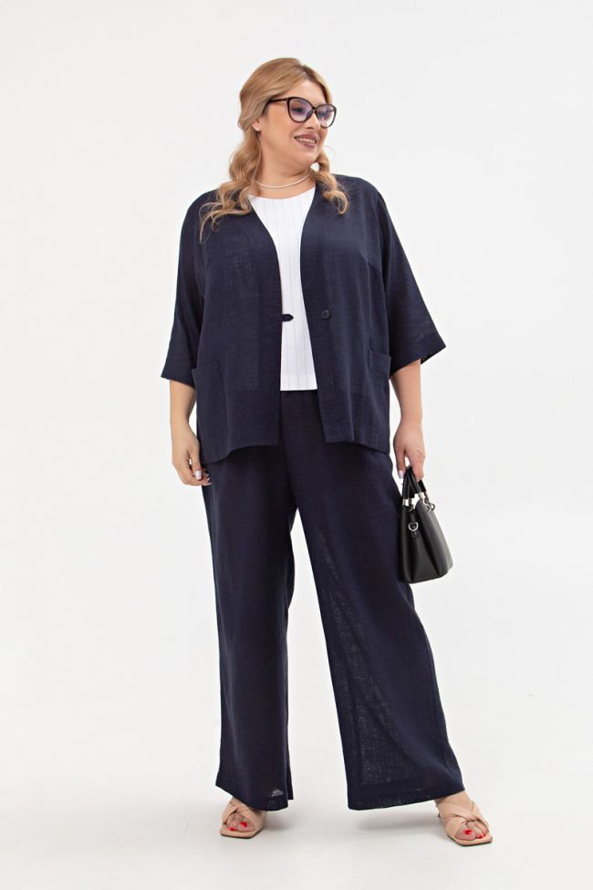 темно-синий Стильный льняной костюм, состоящий из жакета и брюк. Жакет, полуприлегающего силуэта. Прилегание по груди за счет вытачек. Модель с застежкой на 1 петлю и пуговицу. Вырез горловины глубокий, V - образный, дополнен широкой планкой. Рукава втачные 3/4. По бокам удобные, накладные карманы. Низ изделия ровный. Брюки прямого силуэта. Модель с комфортной высокой посадкой на талии. На передних половинках карманы с подрезным бочком , верх с эластичным поясом. Прекрасный вариант для создания как делового, так и повседневного образа в теплое время года.