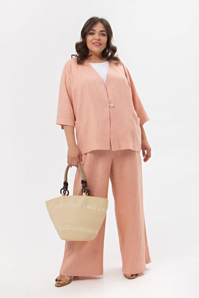 розовый Стильный льняной костюм, состоящий из жакета и брюк. Жакет, полуприлегающего силуэта. Прилегание по груди за счет вытачек. Модель с застежкой на 1 петлю и пуговицу. Вырез горловины глубокий, V - образный, дополнен широкой планкой. Рукава втачные 3/4. По бокам удобные, накладные карманы. Низ изделия ровный. Брюки прямого силуэта. Модель с комфортной высокой посадкой на талии. На передних половинках карманы с подрезным бочком , верх с эластичным поясом. Прекрасный вариант для создания как делового, так и повседневного образа в теплое время года.