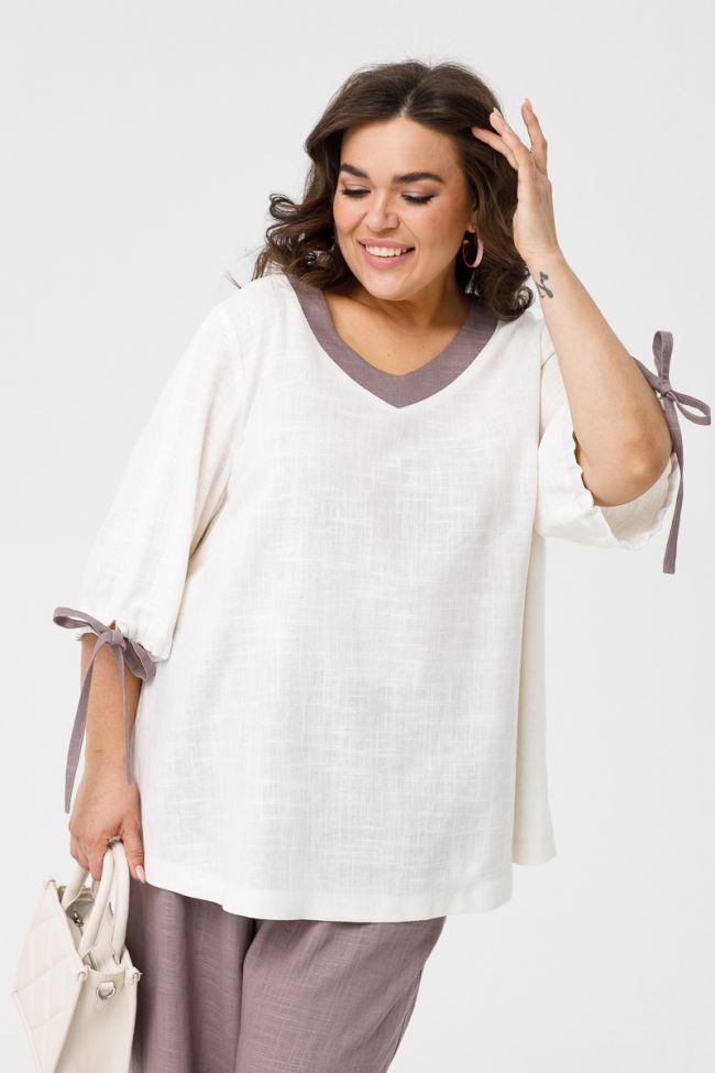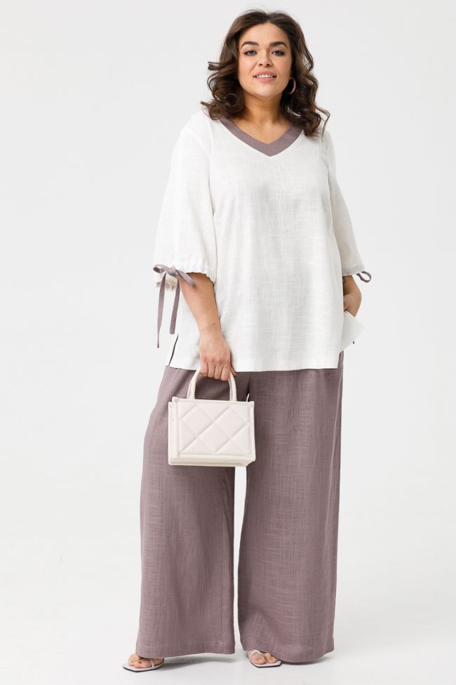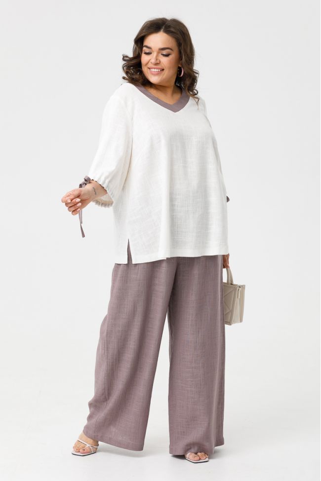 сиреневый Стильный льняной костюм, состоящий из туники и брюк. Туника А - образного силуэта длиной до линии бедер, по бокам - разрезы. Прилегание по груди за счет вытачек. V-образный вырез горловины оформлен контрастной обтачкой в тон брюк. Рукава втачные широкие длиной за локоть, по низу дополнены завязками в тон отделки. Брюки прямого силуэта. Модель с комфортной высокой посадкой на талии. На передних половинках карманы с подрезным бочком, верх с эластичным поясом. Прекрасный вариант для создания как делового, так и повседневного образа в теплое время года.