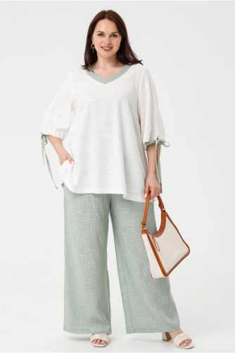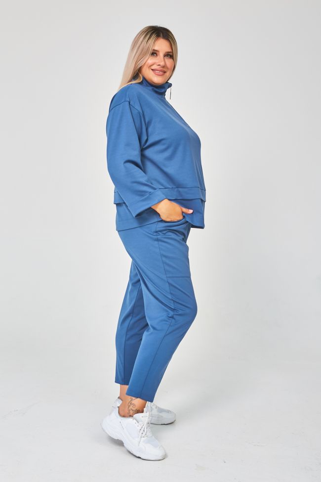 серо-голубой Стильный костюм спортивного плана, состоящий из верха и брюк. Модель из  трикотажного полотна – «джерси», комфортна и практична в носке. Верх прямого силуэта длиной до линии бедра, по низу горизонтальный подрез с дополнительной деталью в шве. Рукава 7/8, на спущенной линии плеча, дополнены манжетой по низу. Круглый вырез горловины оформлен воротником стойка, слева функциональная молния. Брюки свободного силуэта, заужены к низу. По переду большие накладные  карманы. Пояс широкий комбинированный, перед со шнуром, спинка на резине. Длина брюк по внутреннему шву 69 см. Замечательный выбор для ценителей стиля и комфорта.