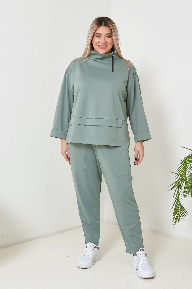 зеленый Стильный костюм спортивного плана, состоящий из верха и брюк. Модель из  трикотажного полотна – «джерси», комфортна и практична в носке. Верх прямого силуэта длиной до линии бедра, по низу горизонтальный подрез с дополнительной деталью в шве. Рукава 7/8, на спущенной линии плеча, дополнены манжетой по низу. Круглый вырез горловины оформлен воротником стойка, слева функциональная молния. Брюки свободного силуэта, заужены к низу. По переду большие накладные  карманы. Пояс широкий комбинированный, перед со шнуром, спинка на резине. Длина брюк по внутреннему шву 69 см. Замечательный выбор для ценителей стиля и комфорта.