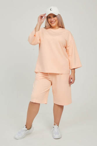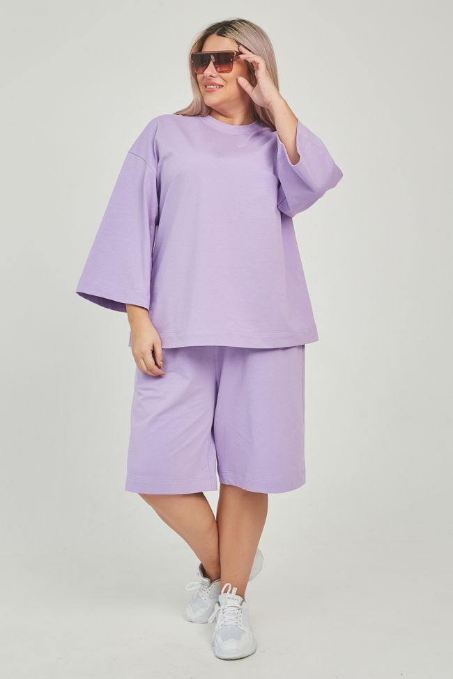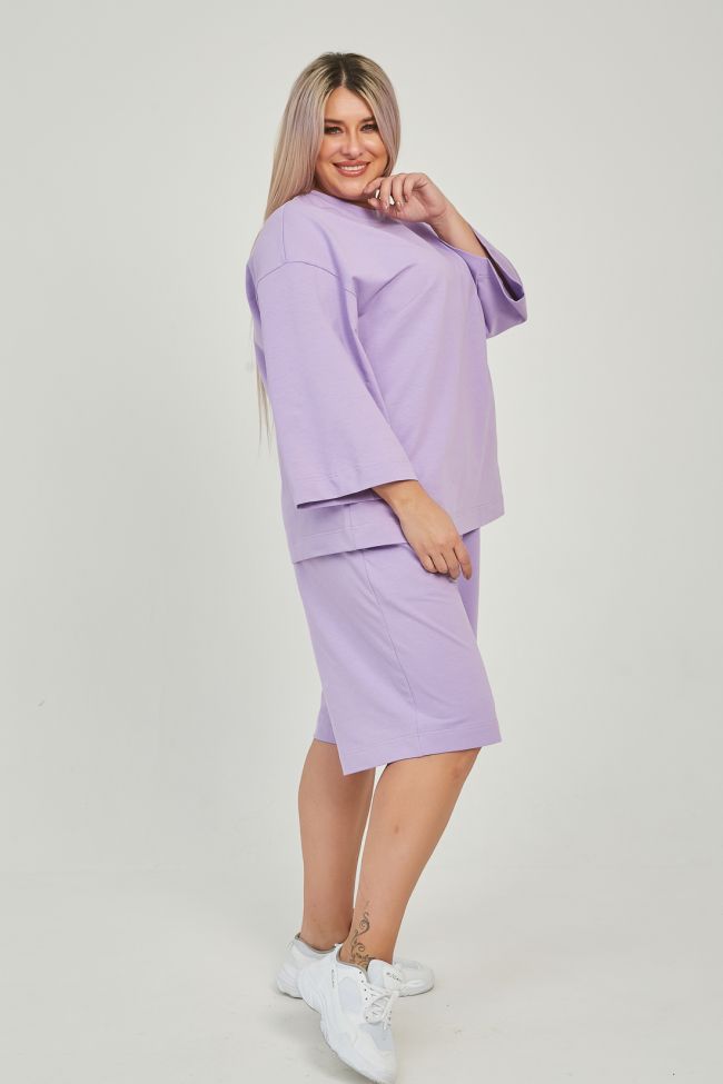 сиреневый Стильный костюм состоящий из джемпера и шорт. Модель выполнена из плотного трикотажа "футер" приятных оттенков. Джемпер прямого силуэта, круглый вырез горловины оформлен бейкой. Рукава широкие, длиной 7/8 на спущенной линии плеча. Прилегание по груди за счет вытачек. Низ ровный. Шорты удлиненные, за линию колен, прямого силуэта. Модель с комфортной высокой посадкой на талии, без застежки. Верх с комбинированным поясом, дополнен резинкой сзади, с переходом на перед. Передние половинки с удобными наклонными карманами.