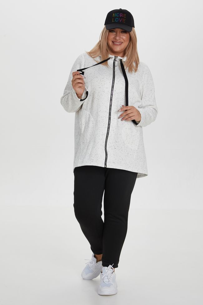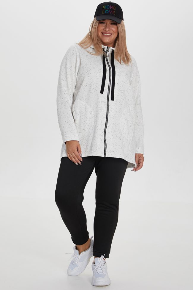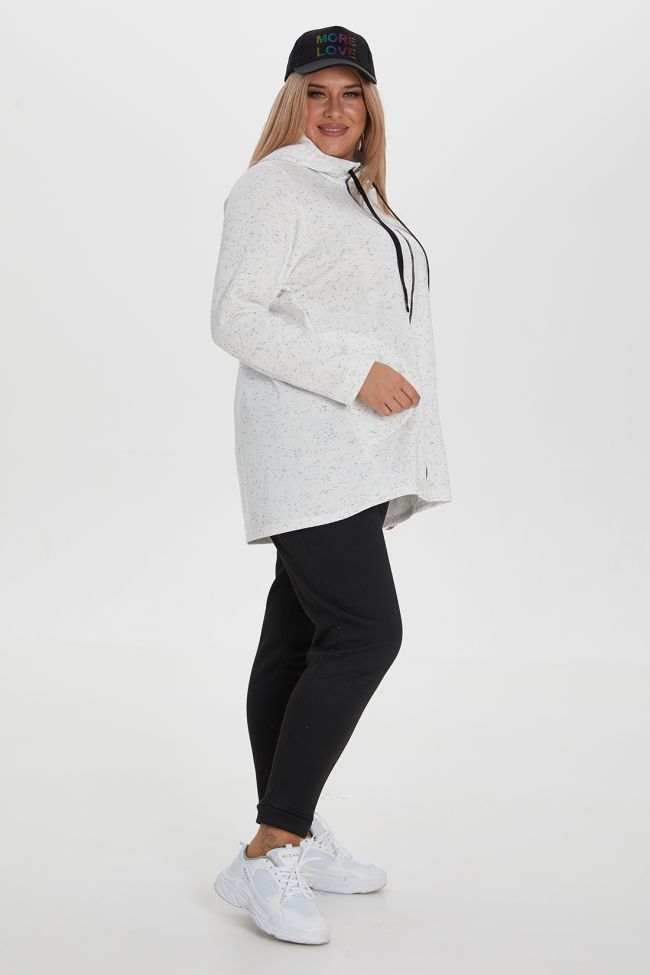 белый Стильный костюм спортивного плана, состоящий из толстовки и брюк. Модель из хлопкового трикотажного полотна-футер с начесом, комфортна и практична в носке. Толстовка слегка трапециевидного силуэта длиной за линию бедра, с длинными втачными рукавами. По всей длине изделия застежка на молнию. Удобные карманы в боковом шве с фиксированной мешковиной с помощью отделочной строчки. Горловина оформлена капюшоном на подкладке из приятной вискозы, с крупными люверсами и завязками. Брюки, прилегающие со средней посадкой на талии, с притачным поясом на резинке и манжетами по низу. Замечательный выбор для ценителей стиля и комфорта.