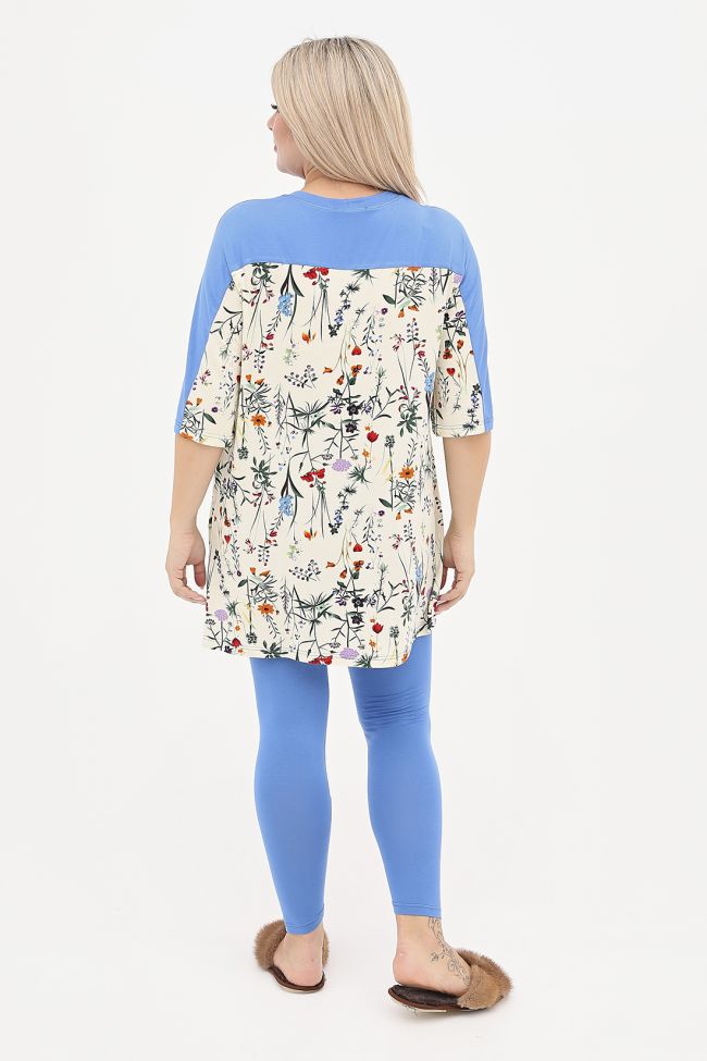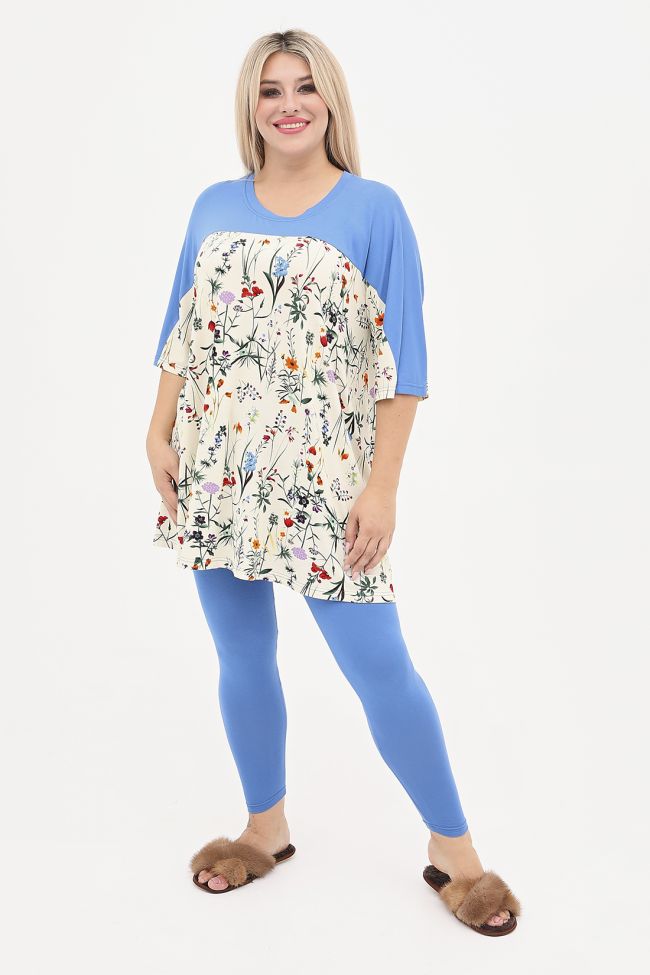 синий Яркий и удобный костюм из вискозного трикотажа. Туника комбинированная, свободного силуэта, длиной ниже линии бедер. Перед и спинка с принтованной кокеткой переходящей на рукав. Рукав длиной за локоть. Круглый вырез горловины обработан бейкой.  Лосины из однотонного трикотажа, с комфортной посадкой, пояс на резине.