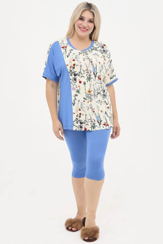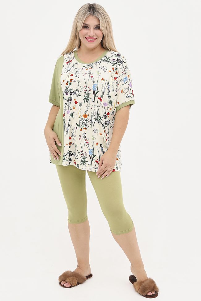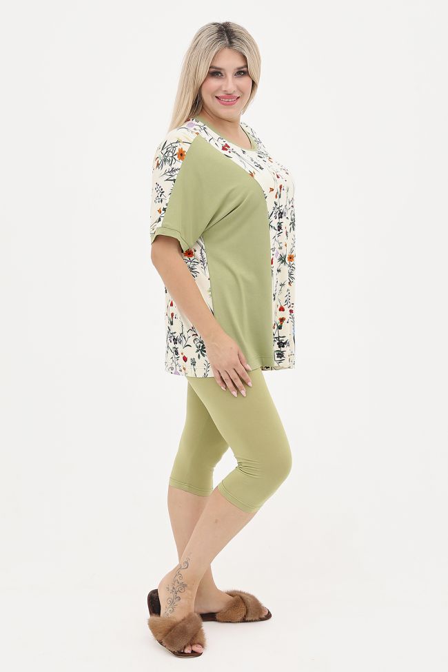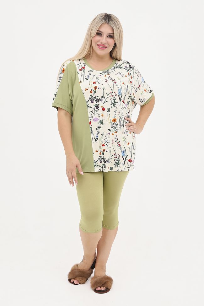 светло-зеленый Яркий костюм из вискозного трикотажа. Комбинированная футболка приталенного силуэта, перед и спинка выполнены из трикотажа принт, с правой стороны переда подрезной бочок из однотона. Круглый вырез горловины и короткие цельнокроенные рукава дополнены однотонной бейкой. Низ прямой. Велосипедки выполнены из однотонного трикотажа, модель с комфортной  посадкой, пояс на резине.