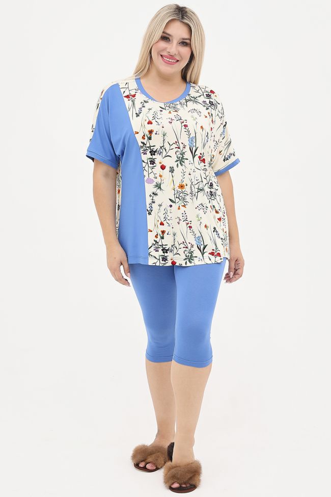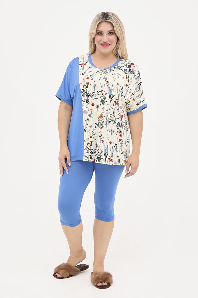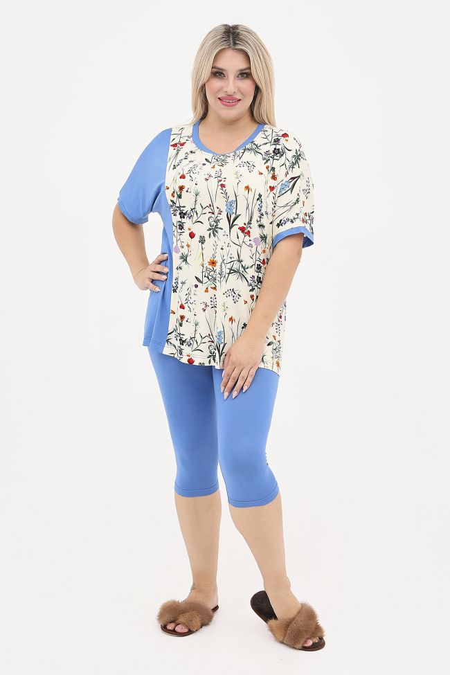 синий Яркий костюм из вискозного трикотажа. Комбинированная футболка приталенного силуэта, перед и спинка выполнены из трикотажа принт, с правой стороны переда подрезной бочок из однотона. Круглый вырез горловины и короткие цельнокроенные рукава дополнены однотонной бейкой. Низ прямой. Велосипедки выполнены из однотонного трикотажа, модель с комфортной  посадкой, пояс на резине.