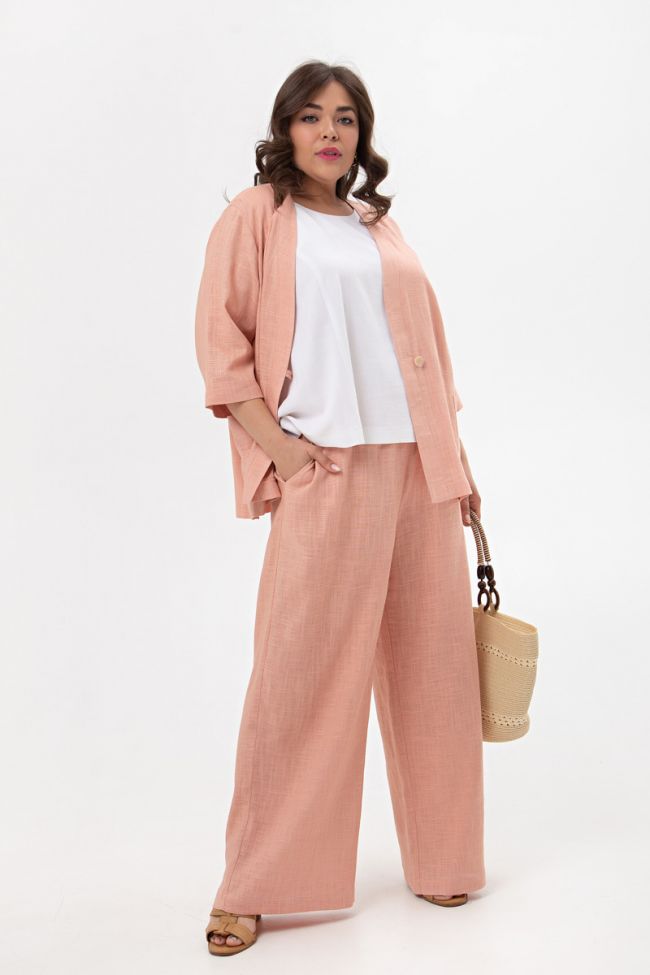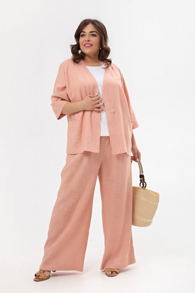розовый Стильный льняной костюм, состоящий из жакета и брюк. Жакет, полуприлегающего силуэта. Прилегание по груди за счет вытачек. Модель с застежкой на 1 петлю и пуговицу. Вырез горловины глубокий, V - образный, дополнен широкой планкой. Рукава втачные 3/4. По бокам удобные, накладные карманы. Низ изделия ровный. Брюки прямого силуэта. Модель с комфортной высокой посадкой на талии. На передних половинках карманы с подрезным бочком , верх с эластичным поясом. Прекрасный вариант для создания как делового, так и повседневного образа в теплое время года.