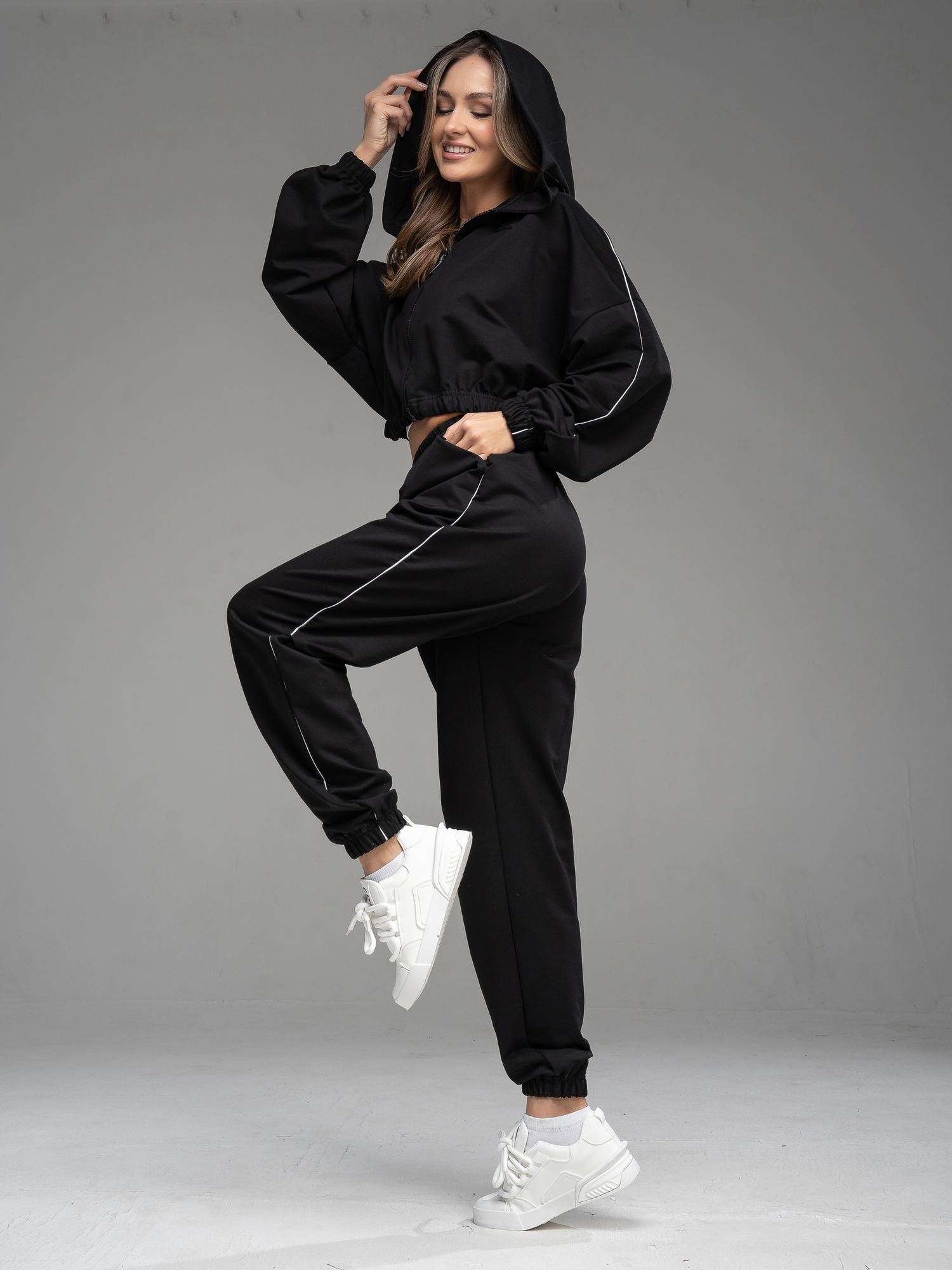 Женский костюм из футера черного цвета без начеса,с стиле "Спорт-шик" состоящий из брюк и кофты с капюшоном на молнии. Толстовка укороченная на молнии свободного силуэта с капюшоном и длинными рукавами. Низ рукавов и толстовки- на резинке. По плечевому шву вставлен отделочный кант. Брюки свободного силуэта с боковыми карманами, по талии и низу изделия- резинка. В боковой шов вставлен отделочный кант. Универсальный спортивный костюм женский для повседневной жизни, выполнен из хлопкового футера 2х нитки (без начеса)- ткань средней плотности, подойдет на весну и осень, (демисезон) и прохладное лето. Наш трикотажный брючный костюм подойдет для занятий спортом, фитнеса, пилатеса, танцев и йоги. Так же в качестве спортивной формы для занятия спортом. Спортивный комплект послужит прекрасным вариантом для прогулок и походов. Хлопковая свободная двойка прекрасно смотрится на девушках разного типа фигуры и благодаря свободной кофте оверсайз подойдет и беременным девушкам. Повседневный трикотажный комплект прекрасно впишется в любой гардероб, т.к. штаны и кофту можно сочетать с любыми вещами из гардероба! Кофту на молнии и спортивки можно носить по отдельности, сочетая их с различными элементами спортивной и повседневной одежды. Плотное трикотажное полотно футер 2-х нитка без начеса, гладкое снаружи, изнутри - мягкое и приятное. В состав хлопковой ткани для эластичности и износостойкости добавлен полиэстер. Он универсален! И в поездке или путешествии будет незаменимым вариантом как на улицу, так и в спортзал. Наша стильная спортивная новинка станет удачным подарком подруге, сестре или любимой девушке на день рождения и любой другой праздник. Изделие выполнено из трикотажа премиального качества - ПЕНЬЕ, с содержанием хлопка более 92%