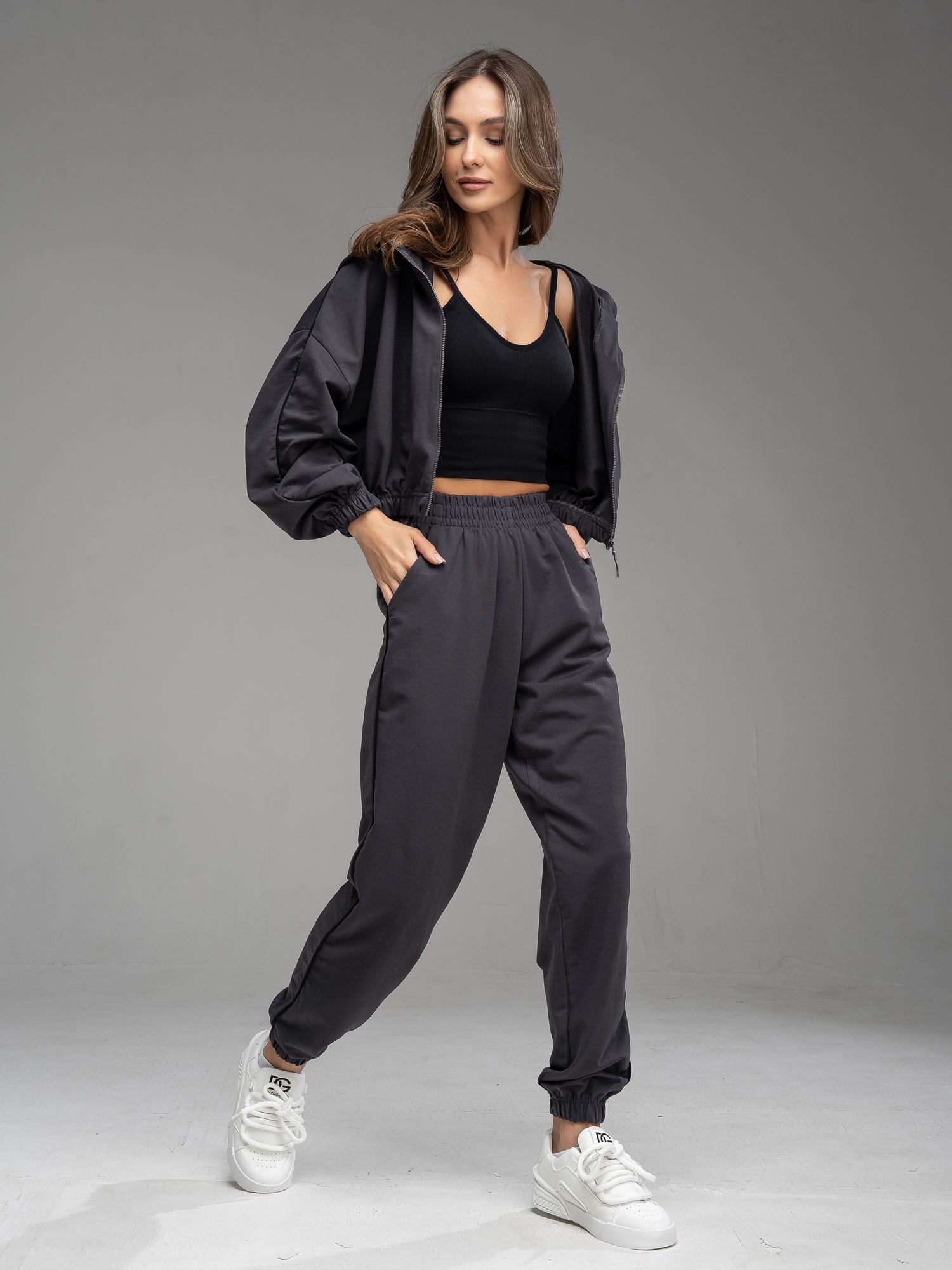Женский костюм из футера антрацитового цвета без начеса,с стиле "Спорт-шик" состоящий из брюк и кофты с капюшоном на молнии. Толстовка укороченная на молнии свободного силуэта с капюшоном и длинными рукавами. Низ рукавов и толстовки- на резинке. По плечевому шву вставлен отделочный кант. Брюки свободного силуэта с боковыми карманами, по талии и низу изделия- резинка. В боковой шов вставлен отделочный кант. Универсальный спортивный костюм женский для повседневной жизни, выполнен из хлопкового футера 2х нитки (без начеса)- ткань средней плотности, подойдет на весну и осень, (демисезон) и прохладное лето. Наш трикотажный брючный костюм подойдет для занятий спортом, фитнеса, пилатеса, танцев и йоги. Так же в качестве спортивной формы для занятия спортом. Спортивный комплект послужит прекрасным вариантом для прогулок и походов. Хлопковая свободная двойка прекрасно смотрится на девушках разного типа фигуры и благодаря свободной кофте оверсайз подойдет и беременным девушкам. Повседневный трикотажный комплект прекрасно впишется в любой гардероб, т.к. штаны и кофту можно сочетать с любыми вещами из гардероба! Кофту на молнии и спортивки можно носить по отдельности, сочетая их с различными элементами спортивной и повседневной одежды. Плотное трикотажное полотно футер 2-х нитка без начеса, гладкое снаружи, изнутри - мягкое и приятное. В состав хлопковой ткани для эластичности и износостойкости добавлен полиэстер. Он универсален! И в поездке или путешествии будет незаменимым вариантом как на улицу, так и в спортзал. Наша стильная спортивная новинка станет удачным подарком подруге, сестре или любимой девушке на день рождения и любой другой праздник. Изделие выполнено из трикотажа премиального качества - ПЕНЬЕ, с содержанием хлопка более 92%