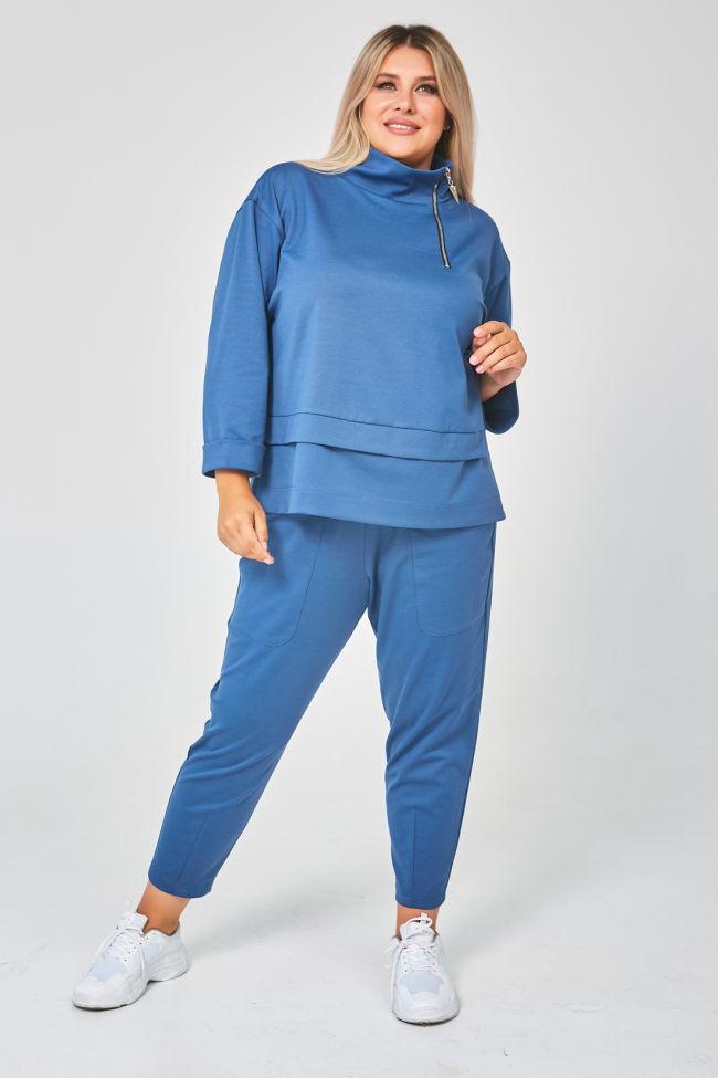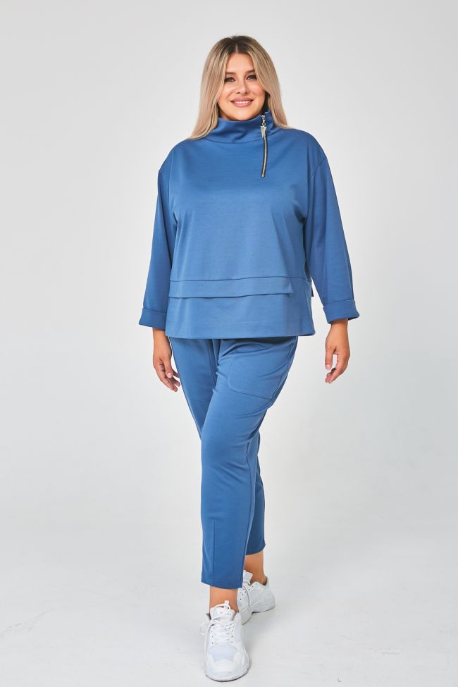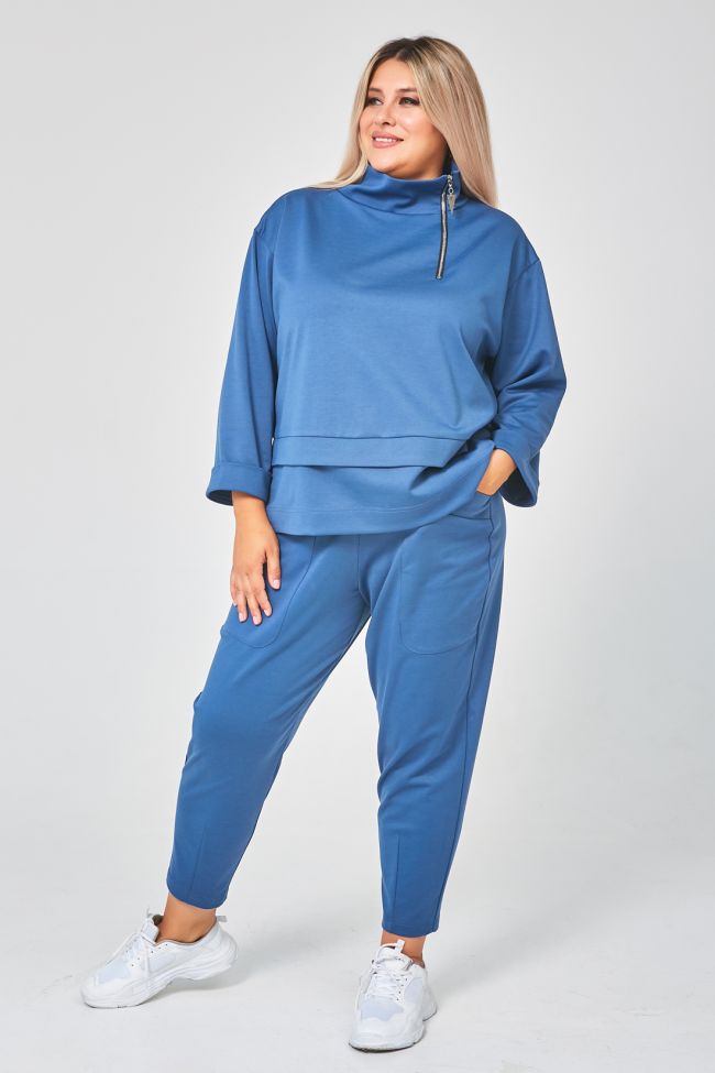 серо-голубой Стильный костюм спортивного плана, состоящий из верха и брюк. Модель из  трикотажного полотна – «джерси», комфортна и практична в носке. Верх прямого силуэта длиной до линии бедра, по низу горизонтальный подрез с дополнительной деталью в шве. Рукава 7/8, на спущенной линии плеча, дополнены манжетой по низу. Круглый вырез горловины оформлен воротником стойка, слева функциональная молния. Брюки свободного силуэта, заужены к низу. По переду большие накладные  карманы. Пояс широкий комбинированный, перед со шнуром, спинка на резине. Длина брюк по внутреннему шву 69 см. Замечательный выбор для ценителей стиля и комфорта.
