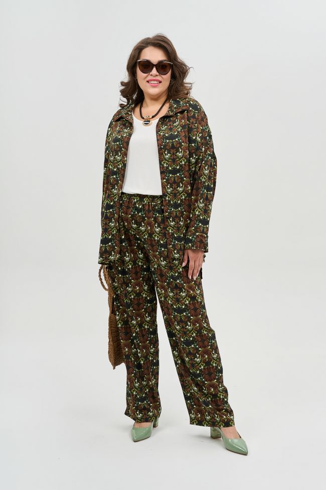 зеленый Стильный костюм из струящейся принтованной ткани, состоит из рубашки и брюк. Рубашка прямого силуэта. Воротник - рубашечного типа, по переду центральная застежка на петли и пуговицы.  Линия плеча спущеная. Рукав длинный, по низу дополнен манжетой с застежкой на петлю и пуговицу. Низ разноуровневый с удлиненной спинкой. Боковые швы дополнены разрезами. Брюки свободные прямого силуэта. Модель с комфортной высокой посадкой на талии. По переду удобные карманы с подрезным бочком. Пояс на широкой резине. Замечательный выбор для ценителей стиля и комфорта.