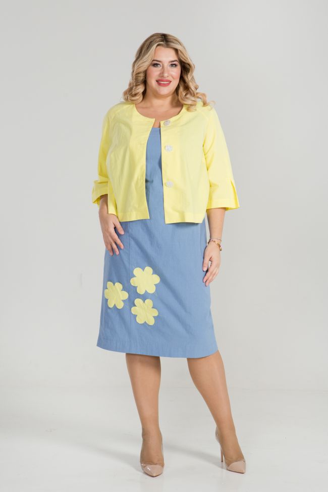 голубой Женственный комплект из дышащей ткани двух оттенков. Укороченный жакет прямого силуэта, с центральной застежкой на петли и пуговицы, прилегание по груди за счет вытачек. Круглый вырез горловины обработан внутренней обтачкой. Втачной рукав длиной 3/4 со швом по центру, оканчивающимся оригинальной бантовой складкой.  Платье без рукавов, прилегающего силуэта, по переду прилегание за счет отрезной линии груди и вертикальных рельефов. Спинка с вертикальными рельефами и средним швом оканчивающимся бантовой складкой. В левом боковом шве - застежка на тесьму -молнию. Оригинальностью модели является аппликация по переду из цветов в тон жакета. Прекрасный вариант для создания женственного стильного образа.