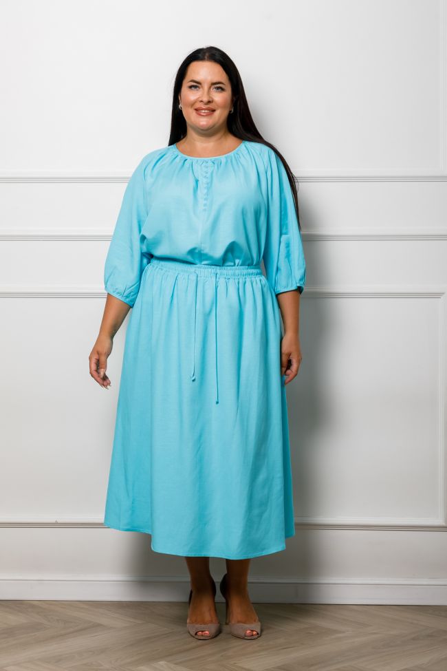 бирюзовый Летний костюм из льняной ткани, состоит из блузы и юбки. Блуза свободного силуэта длиной до линии бедер, с разноуровненным низом. Круглый вырез горловины со сборкой, обработанный окантовкой  мягко подчеркивает обьем груди. Рукава покроя реглан, длиной 3/4 со сборкой по низу.   Юбка силуэта трапеция, длина миди,  без подклада. Пояс на широкой резине, дополнен декоративным шнуром. Стильный, удобный костюм отлично разнообразит ваш летний гардероб.