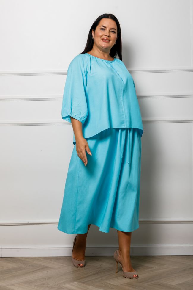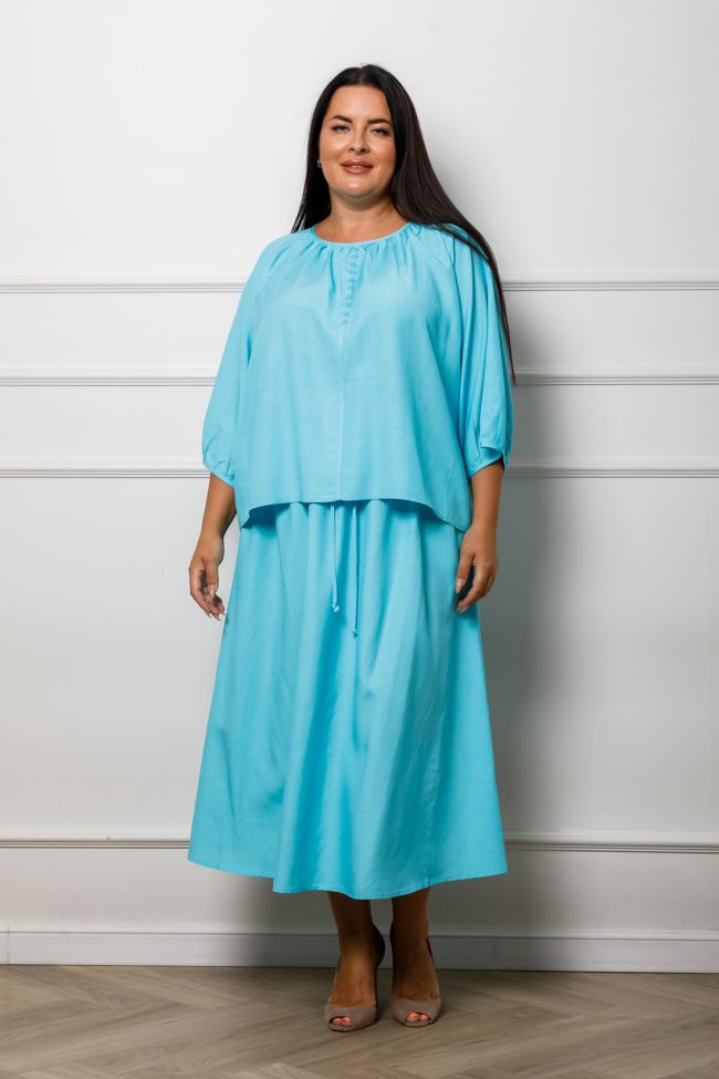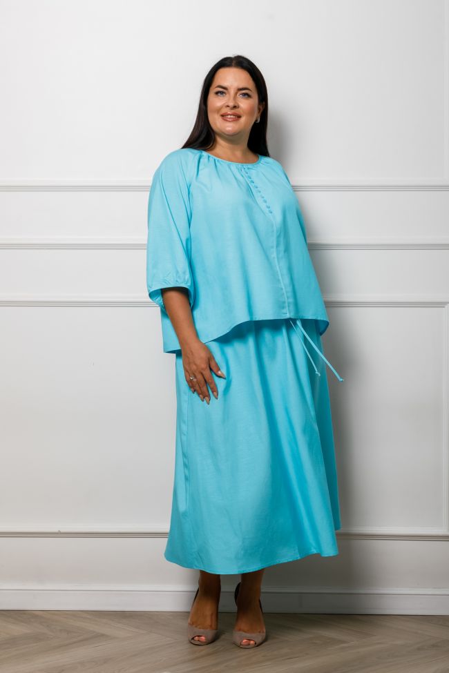 бирюзовый Летний костюм из льняной ткани, состоит из блузы и юбки. Блуза свободного силуэта длиной до линии бедер, с разноуровненным низом. Круглый вырез горловины со сборкой, обработанный окантовкой  мягко подчеркивает обьем груди. Рукава покроя реглан, длиной 3/4 со сборкой по низу.   Юбка силуэта трапеция, длина миди,  без подклада. Пояс на широкой резине, дополнен декоративным шнуром. Стильный, удобный костюм отлично разнообразит ваш летний гардероб.
