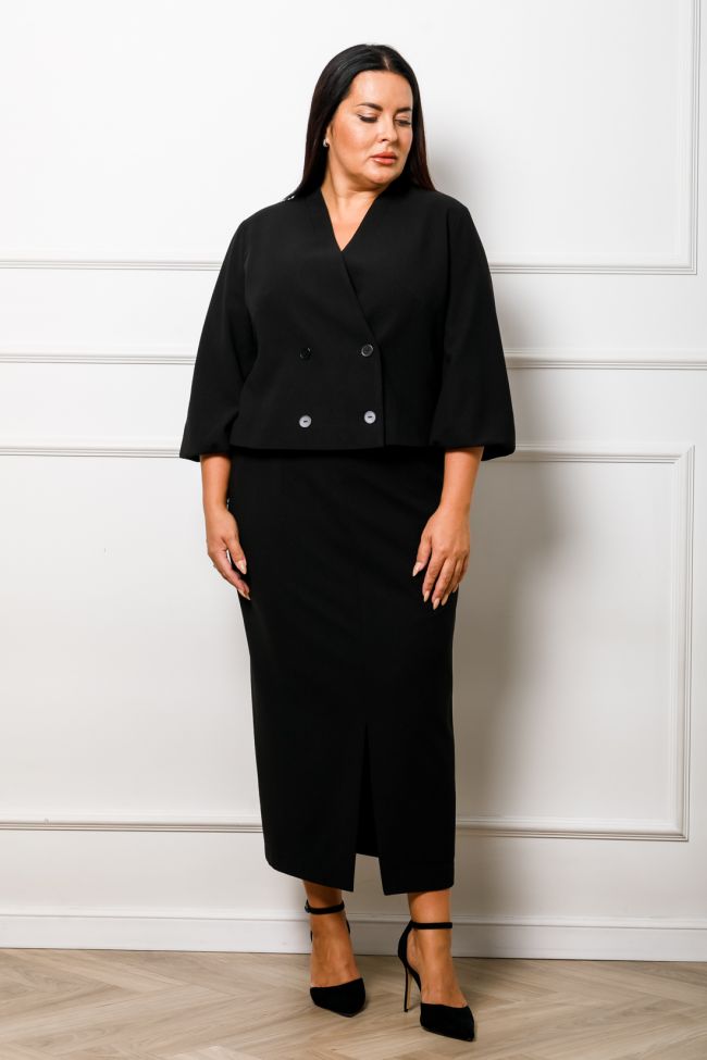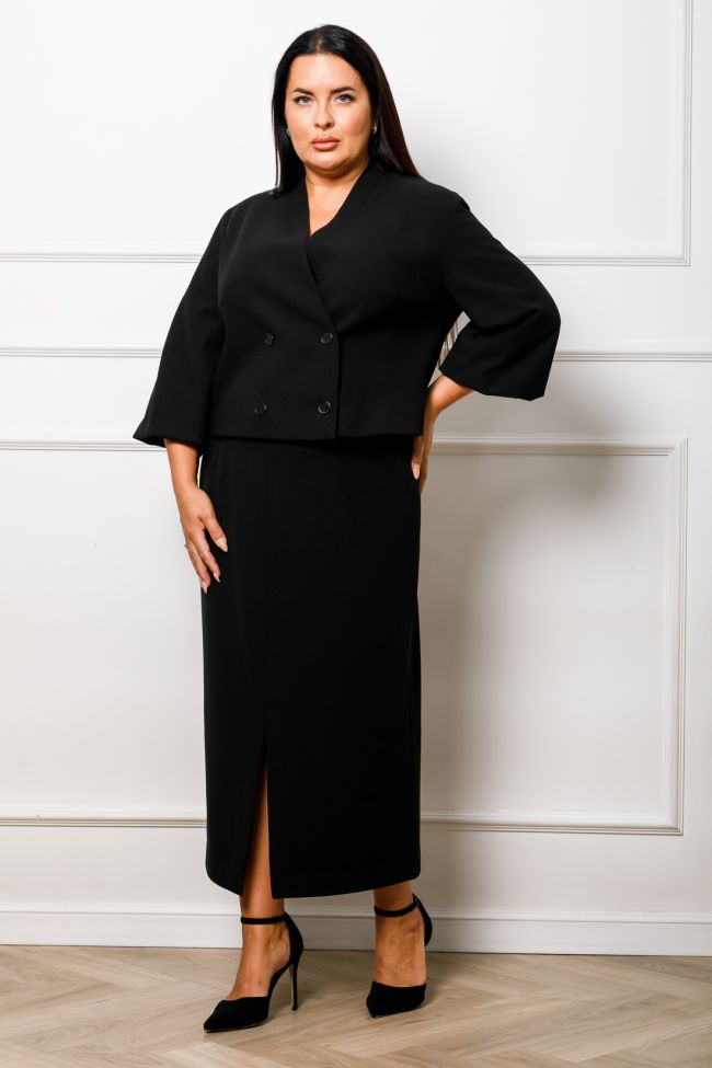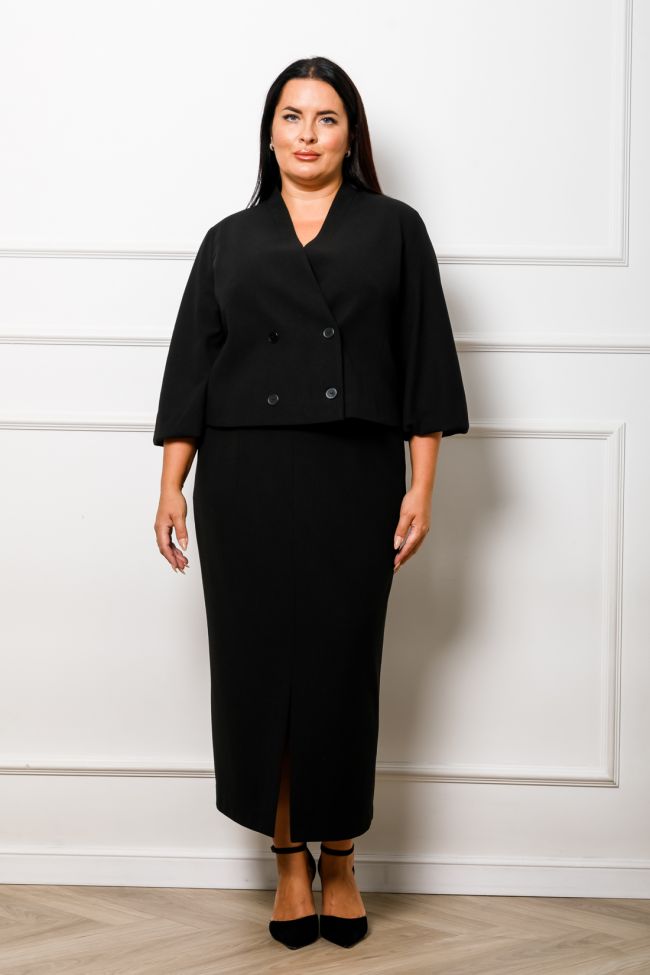 черный Стильный костюм из трикотажа "Диор", состоит из жакета и юбки.  Жакет на подкладе, полуприлегающего силуэта, длиной веше линии бедра. Прилегание по фигуре за счет рельефов по переду и спинке. Застежка жакета смещенная на две пуговицы. Горловина V-образная с небольшой стойкой зрительно удлиняет шею. Рукава втачные, к низу расширены типа фонарик. Классическая юбка, в среднем шве заднего полотнища тесьма - молния. По центральному шву переда - разрез. Пояс комбинированный, с застежкой на петлю и пуговицу. Прекрасный вариант для создания как делового, так и повседневного образа.
