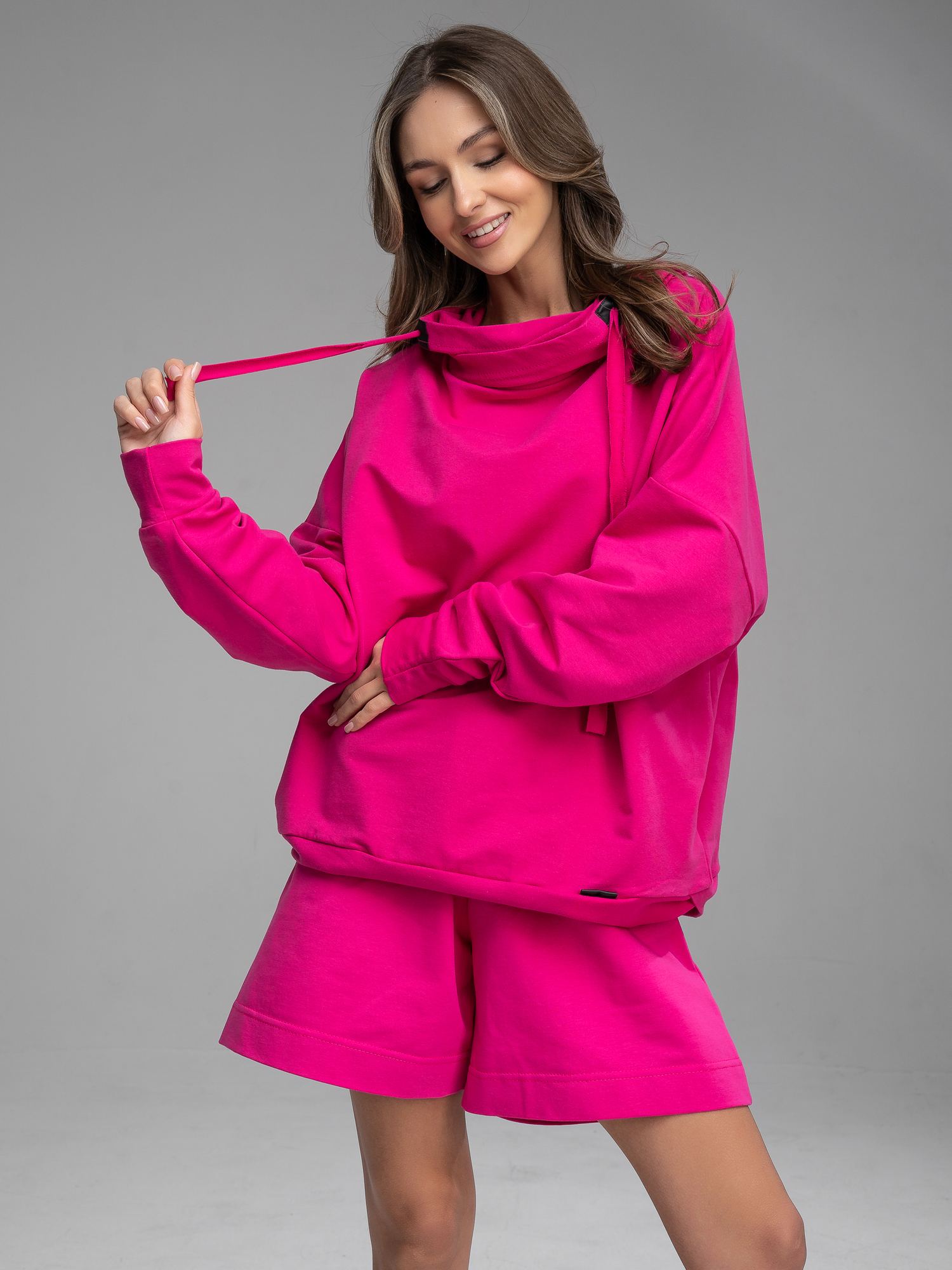 Стильный комплект из худи и шорт. Джемпер силуэта "оверсайз" с объемным капюшоном и длинными свободными рукавами. Капюшон украшен отделочными элементами из эко-кожи и шнуром в тон изделию. Укороченные шорты свободного силуэта с боковыми карманами. Пояс c широкой эластичной резинкой и шнуром, низ с отворотом. Изделие выполнено из трикотажа премиального качества - ПЕНЬЕ, с содержанием хлопка более 92%