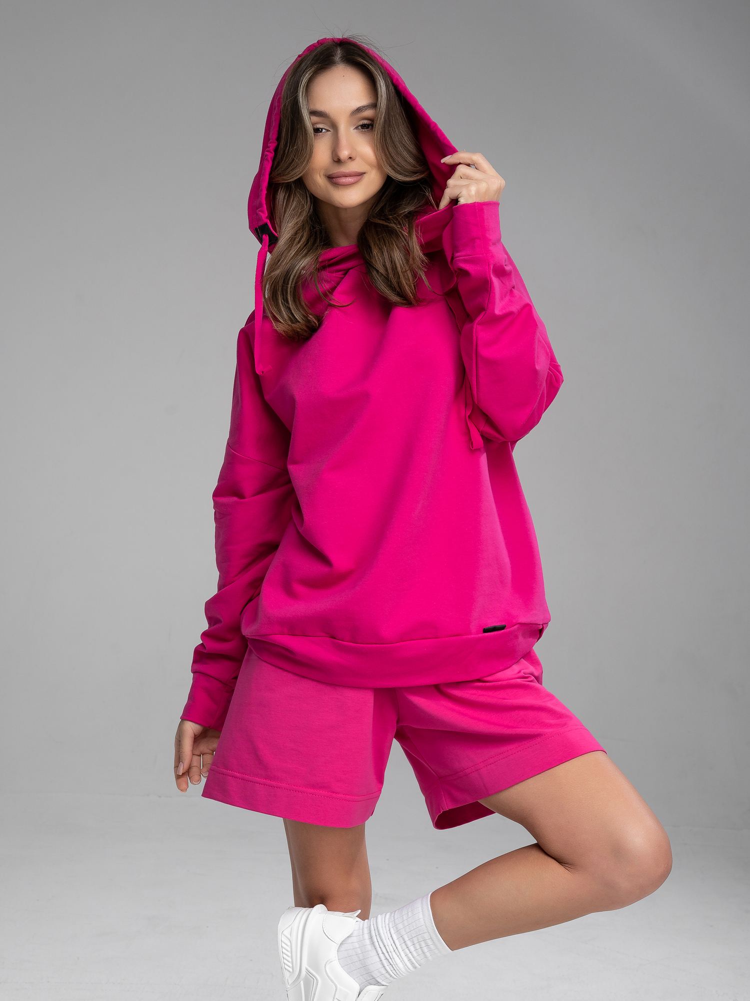 Стильный комплект из худи и шорт. Джемпер силуэта "оверсайз" с объемным капюшоном и длинными свободными рукавами. Капюшон украшен отделочными элементами из эко-кожи и шнуром в тон изделию. Укороченные шорты свободного силуэта с боковыми карманами. Пояс c широкой эластичной резинкой и шнуром, низ с отворотом. Изделие выполнено из трикотажа премиального качества - ПЕНЬЕ, с содержанием хлопка более 92%
