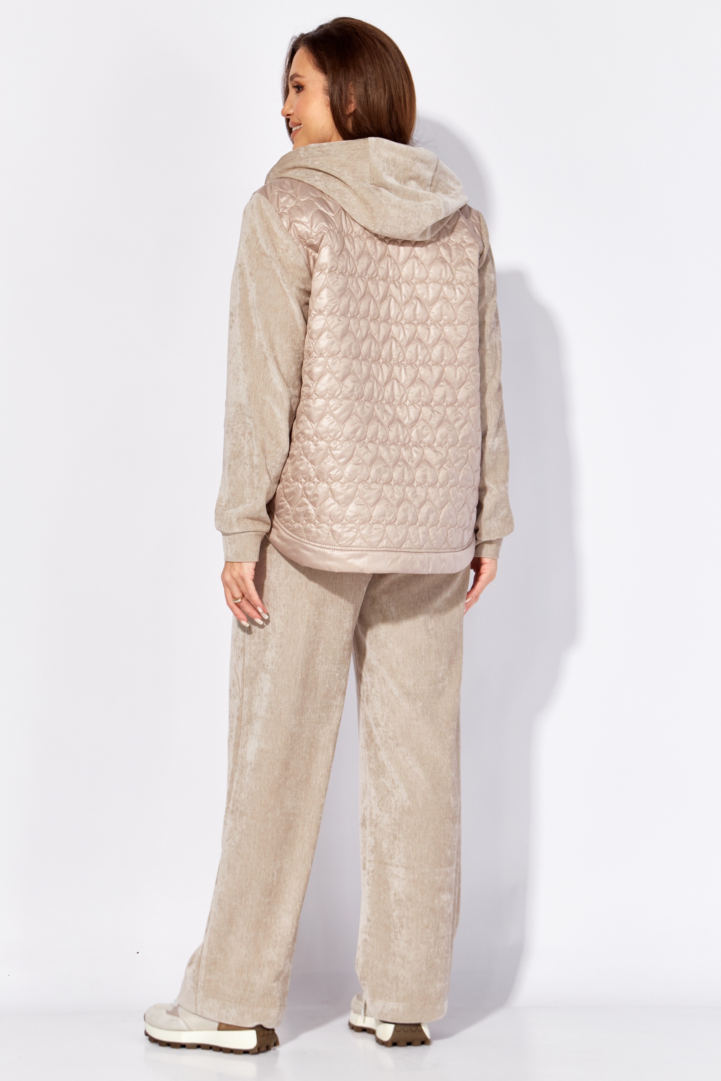 Стильный комплект, выполненный из высококачественного полиэстера и вискозы, что обеспечивает комфорт и долговечность. Куртка с капюшоном и стеганым дизайном, дополненная фигурной формой низа, отлично подходит для прохладных дней. Брюки из вельвета добавят тепла и изящества в любой повседневный лук. Длинные рукава и центральная застежка на молнию обеспечивают практичность и удобство. Нейтральный жемчужный цвет станет универсальным дополнением к вашему гардеробу, подчеркивая утонченность и стиль.