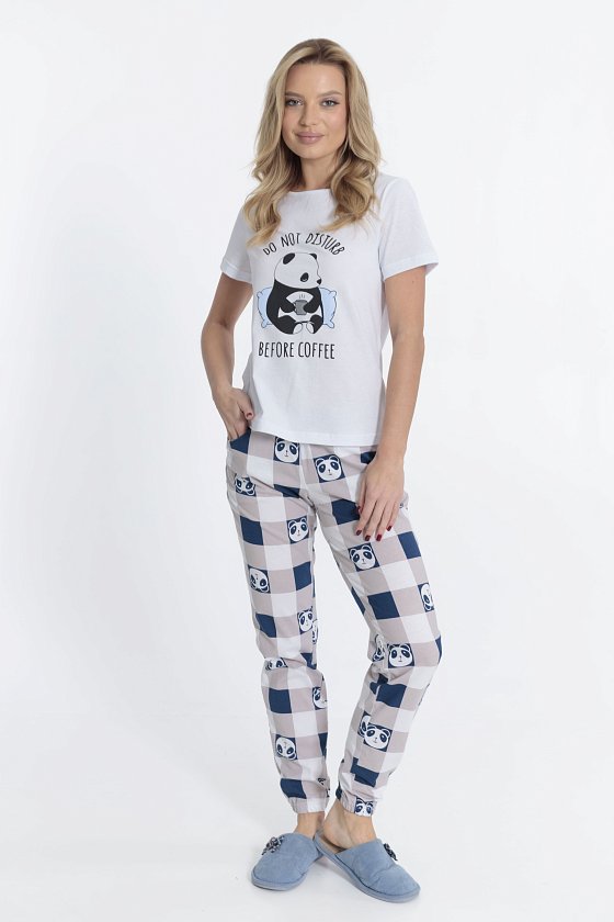 Костюм выполнен из кулирки, 100% хлопок. Футболка однотонная, c коротким рукавом и круглым вырезом горловины, с принтом спереди. Брюки на резинке сверху и снизу, с боковыми карманами.