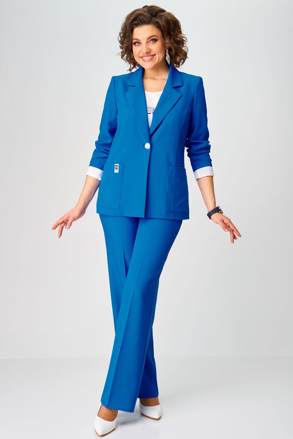 Комплект женский трех предметный, состоит из жакета и юбки. Жакет слегка притален, удлиненный, с центральной застежкой на 1 петлю и пуговицу, с воротником пиджачного типа. Низ бортов прямой. По переду бочек и функциональные накладные карманы. Спинка со средним швом без особенностей. Рукава втачные, двухшовные на подкладке с имитацией манжеты. Блузка прямого силуэта с округлым везом горловины и нагрудными вытачками. Рукав втачной короткий. Спинка без особенностей  Брюки прямого силуэта с заутюженными стрелками и притачным поясом. Для максимально комфортной посадки по бокам пояса вставлена эластичная резинка. Застёжка на молнию с гульфиком и пуговица по поясу. По переду в боковых швах карманы. Задние половинки брюк с талевыми вытачками.   Длина жакета 68 см, Длина рукава без отварота манжеты 62 см. Длина блузки 63см, длина рукава блузки 30см. Длина брюк 111 см
