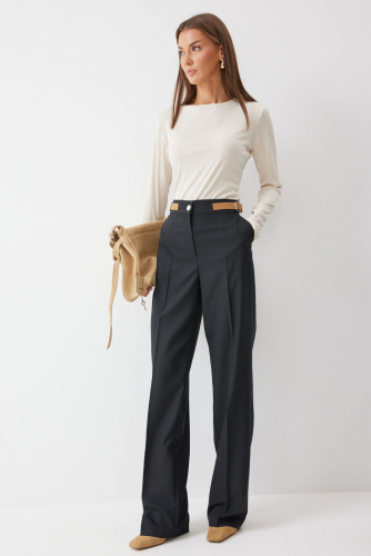 Брюки широкие, свободного прямого силуэта, на притачном поясе. Застёжка на тесьму-молнию в среднем шве переда и петлю и пуговицу по поясу.