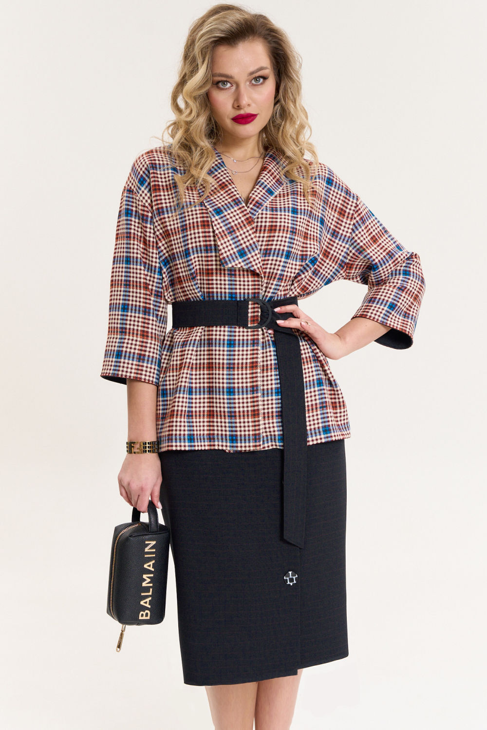 Комплект женский 2-предметный (жакет и юбка). Жакет из текстильной ткани в клетку прямого силуэта, со спущенным плечом. Воротник - ассиметричный: апаш и шалевый. Рукав 3/4 длины, с отложной манжетой из отделочной ткани. Застежка - на запах, фиксируется съемным поясом. Юбка однотонная (в мелкую клетку) зауженная к низу, по полочке по линии колена - складка, переходящая в шлицу. Идеальная длина для невыскоких женщин. Отделка в виде пуговиц. По спинке: средний шов, молния, пояс отрезной с резинкой.  Длина спинки (жакет)- (50-54)-68см, (56-60)-71см.  Длина рукава: (50-54)-40 см, (56-60)-42см. Длина юбки 65см