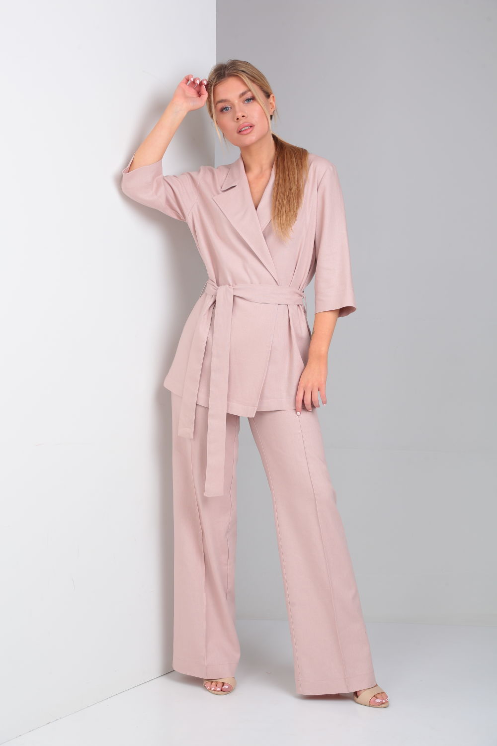 Комплект женский двухпредметный состоящий из жакета и брюк. Жакет свободного кроя на запах, под пояс (без застежки). Воротник пиджачного типа, отложной с лацканами. Рукав втачной, трёхчетвертной. Брюки свободного кроя с иммитацией застёжки, пояс на резинке, боковые карманы с подрезным бочком.