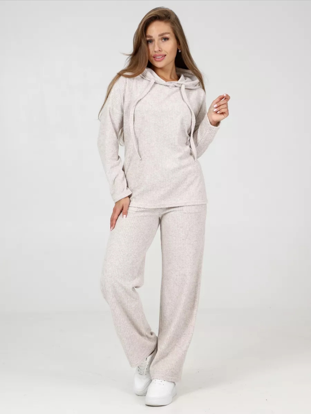 Махровый костюм в рубчик - это великолепное сочетание уюта, тепла и стиля, которое идеально подходит для дома. Костюм состоит из худи свободного кроя с длинным рукавом со спущенным плечом и брюк прямого кроя с карманами.