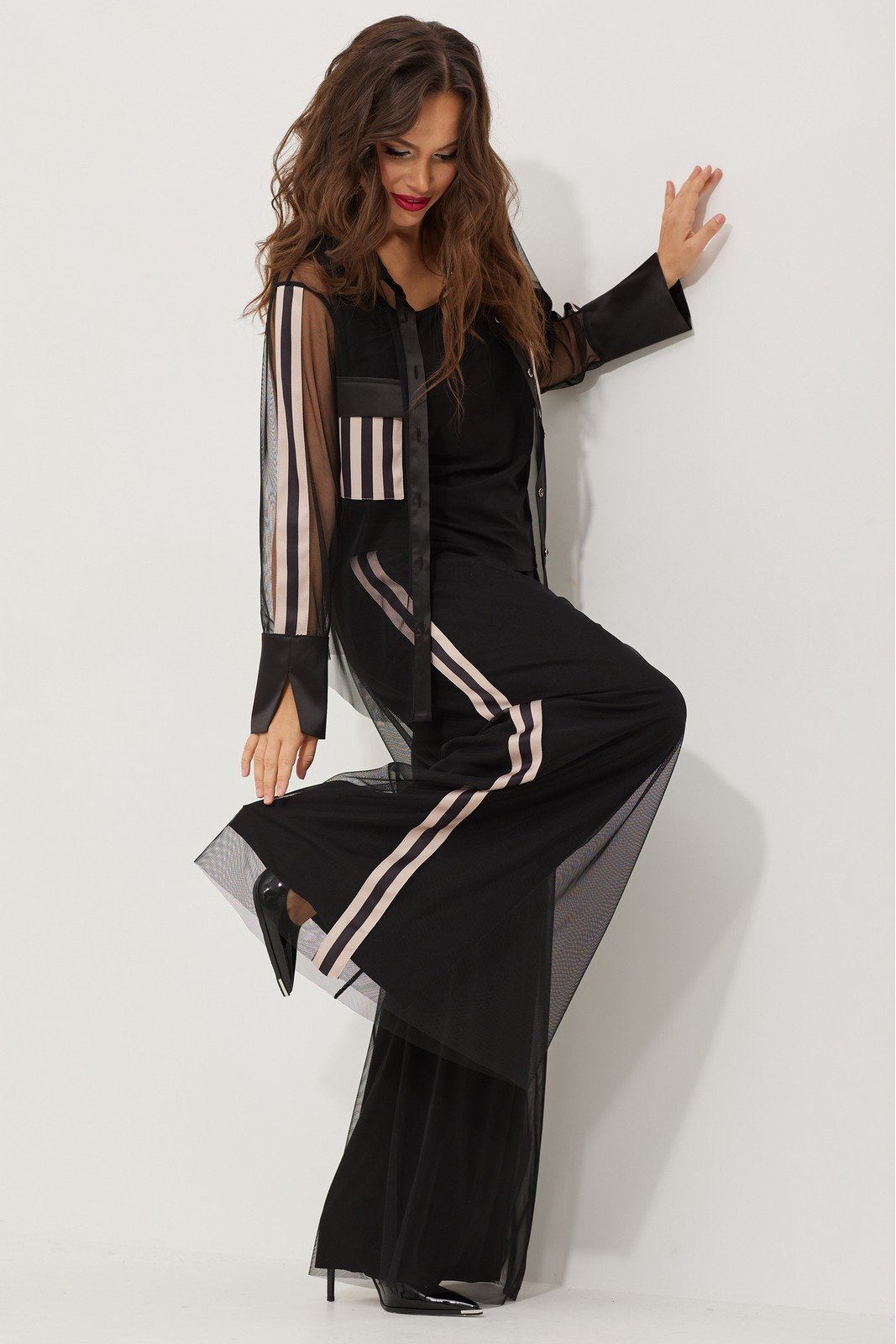 Стильный нарядный комплект из блузы, топа и брюк. Блуза прямого кроя с центральной застежкой на пришивные пуговицы. Выполнена из текстильной мелкой сетки. Дополнена отложным воторником на стойке, манжетами и планкой по застежке, выполненными из шелковистой поливискозной ткани с легким атласным блеском. Отделка карманомв и рукавов выполнены из шелковистой ткани в черно-пудровую полоску. Топ свободного кроя с широкими бретелями. Брюки свободного кроя с притачным поясом , дополненным эластичной тесьмой. Выполнены из нижней черной струящейся ткани и наложенной на нее воздушной такстильной сетки. По боковому шву брюки дополнены отделкой из черно-пудровой полоски. Низ брюк по сетке с необработанным краем, что позволит с легкостю корректировать длину. Длина Блузы от плечевого шва 66см. Длина топа 61см. Длина брюк по боковому шву по сетке 110 см., по основной ткани 106см.