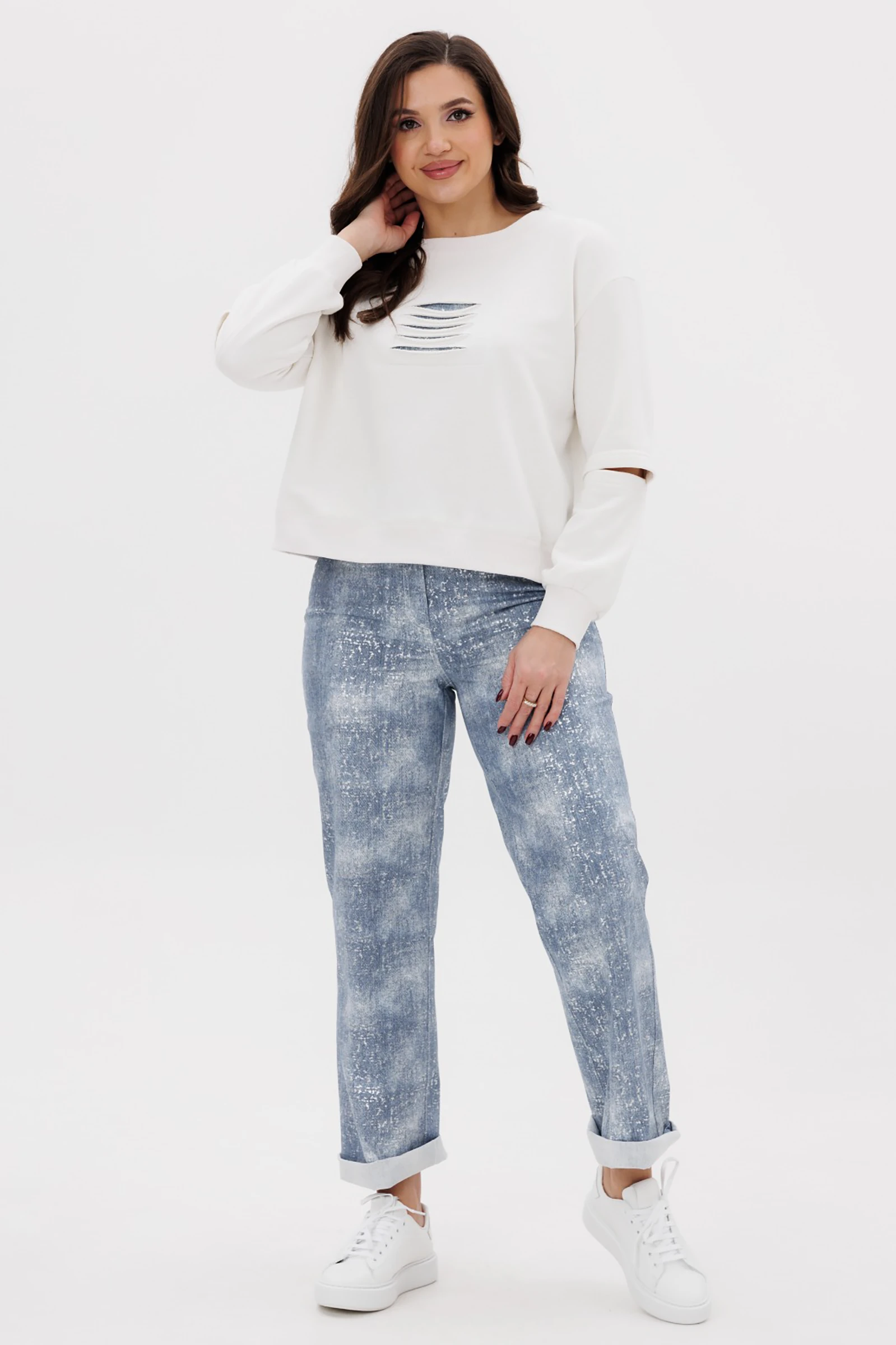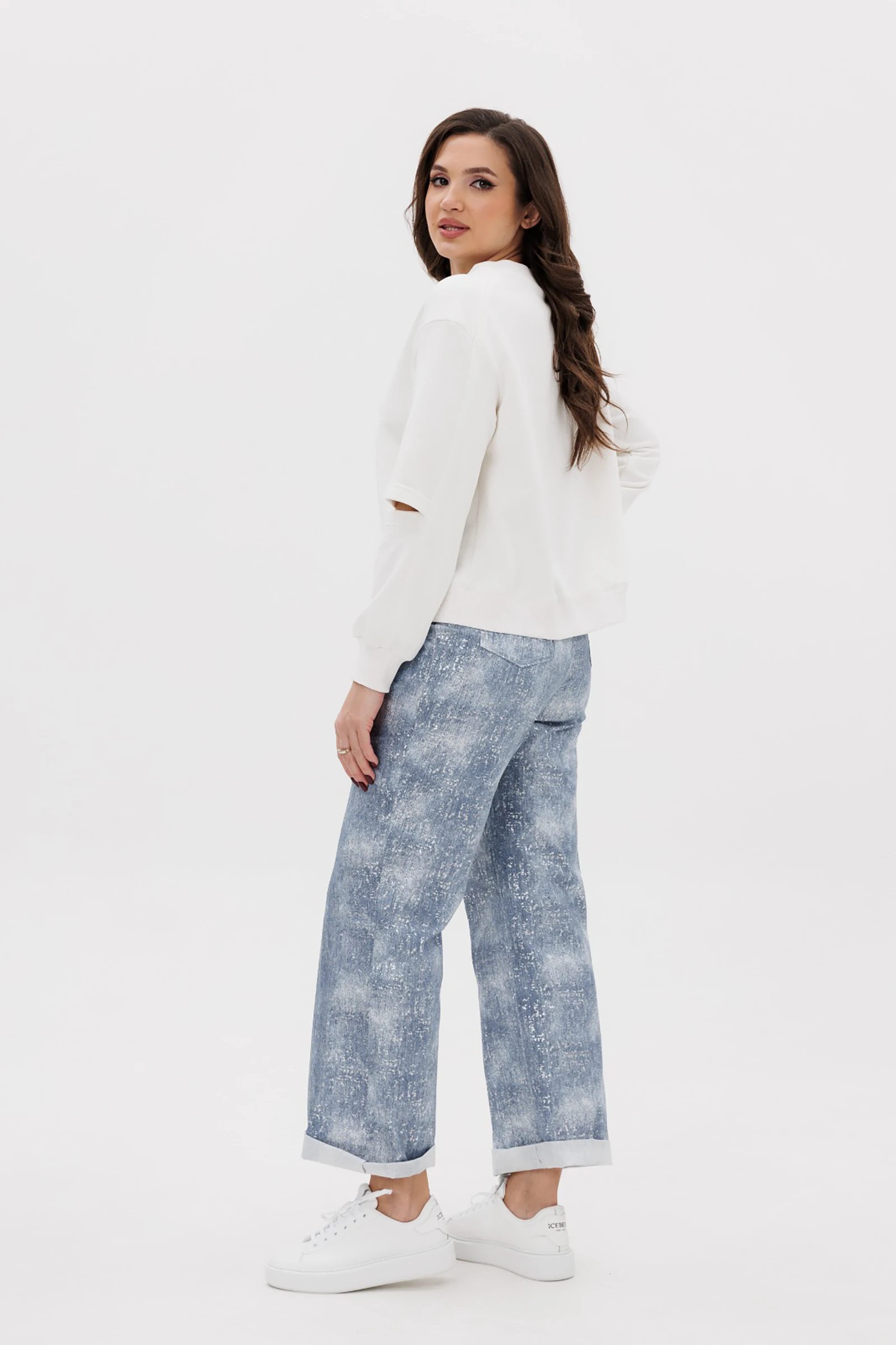 Длина рукава с плечом около 74 см.  Джинсы высокой посадки  с  серебристым напылением с классическими 5-ю карманами. Задние половинки с отрезными кокетками и вытачкой от бокового шва. Длина брюк около 105 см