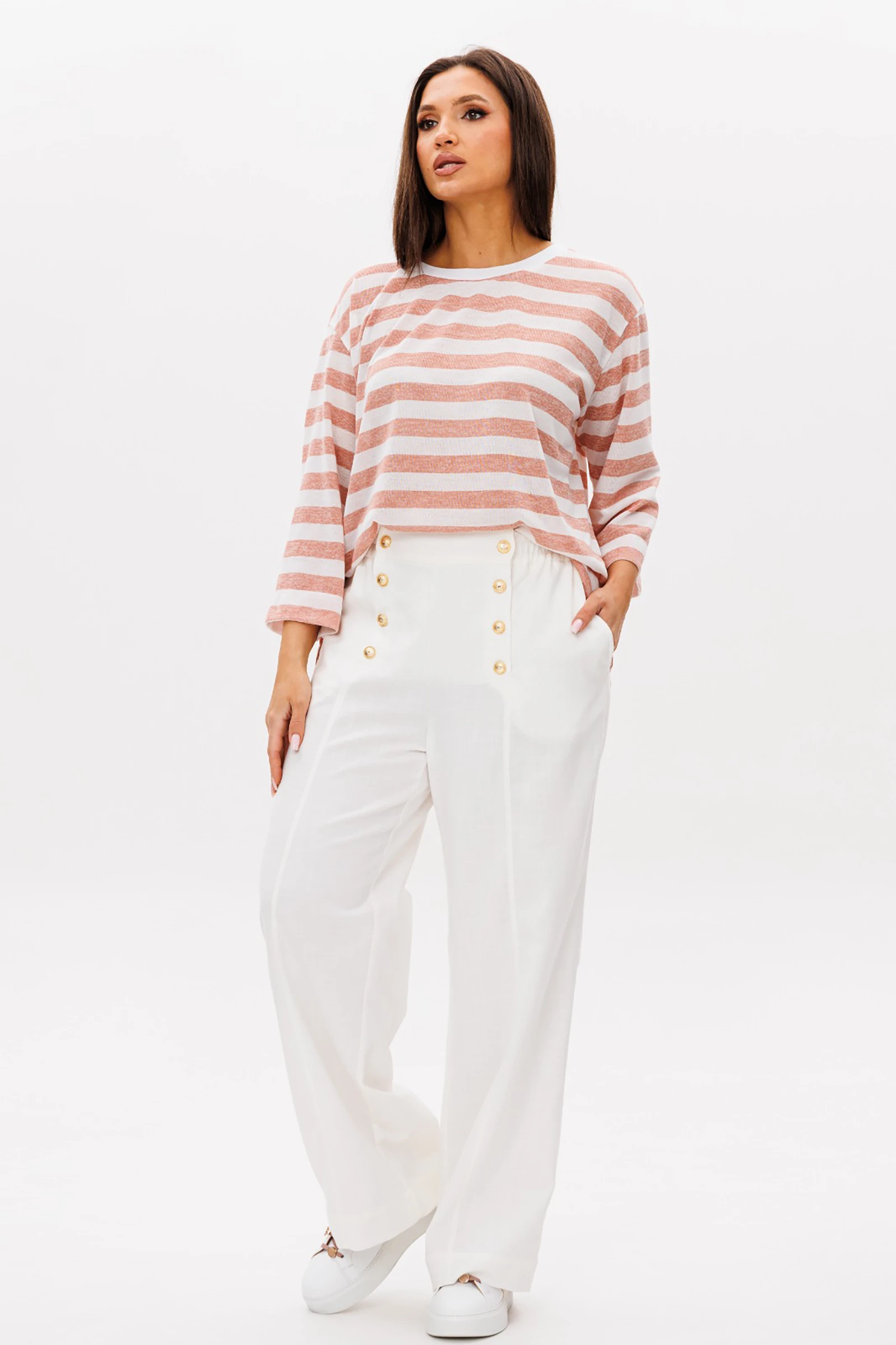 Воплотить уникальный образ на основе базовых вещей оказывается не так уж и сложно. Идеальное сочетание и пропорции-трикотажный джемпер в полоску и белые брюки с акцентной металлической фурнитурой.Такой комплект вы можете миксовать по собственному вкусу, дополняя уже имеющиеся в гардеробе вещи. Свободный, расширенный силуэт, рубашечный покрой, рукав расширенный в области оката. По горловине отделочная тесьма-довяз. Брюки из смесовой льняной ткани, свободного покроя, на притачном поясе, эластичном в области спинки и частично переда. Передние половинки брюк мс оригинальной застежкой, центральным швом и наклонными боковыми карманами.Длина джемпер около 67см.Длина рукава около 30см.Длина брюк около 104 см.