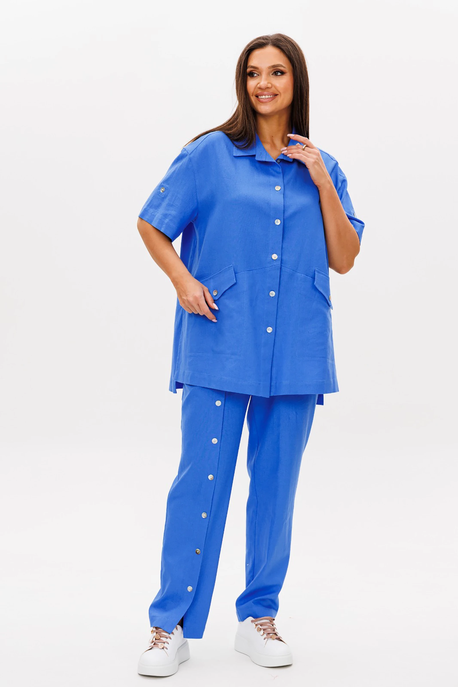 Главный тренд этого года и самый востребованный материал в жаркий сезон, конечно же лён.Модницы, которые ценят комфорт и универсальность, обязательно имеют в своем гардеробе вещи из этого уникального полотна.Брючный комплект всегда смотрится эффектно и дорого. Свободная, упрямлённая рубашка и брюки в расслабленном стиле. Покрой - рубашечный, воротник классический рубашечный, застёжка центральная. Полочка с диагональным членением и карманом с клапаном. Спинка с отрезной кокеткой и мягкими складками. В боковых швах - разрезы. Рукав с отделочной пуговицей.Брюки свободные, слегка зауженные к низу, на эластичном поясе с наклонными карманами. Правая передняя половинка брюк со сквозной шлицей и пуговицами.Длина брюк около 102 см. Длина рубашки около 77 см. Длина рукава около 20 см.