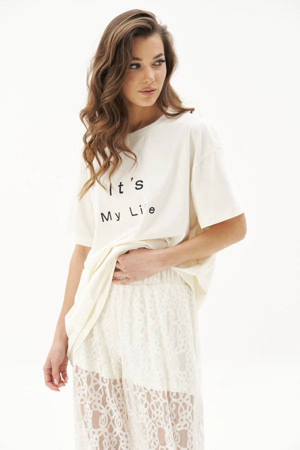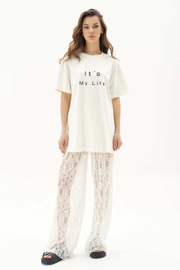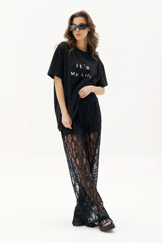 Мода лета 2024 представляет прозрачные ткани, как один из ключевых трендов сезона.Платья из таких полотен уже давно не в новинку, но в этом сезоне к ним мы добавили другую вариацию женской одежды : невероятный брючный комплект, который, развеваясь шикарными складками, создаёт у окружающих иллюзию подглядывания.Свободная футболка и гипюровые брюки с эластичными шортами внутри.Футболка широкая, удлинённая, с дизайнерским принтом и заниженной линией плеча.Брюки в свободном, расслабленном стиле, на притачном эластичном поясе и с подкладкой шортами из хб трикотажного полотна.Длина брюк около 105см.