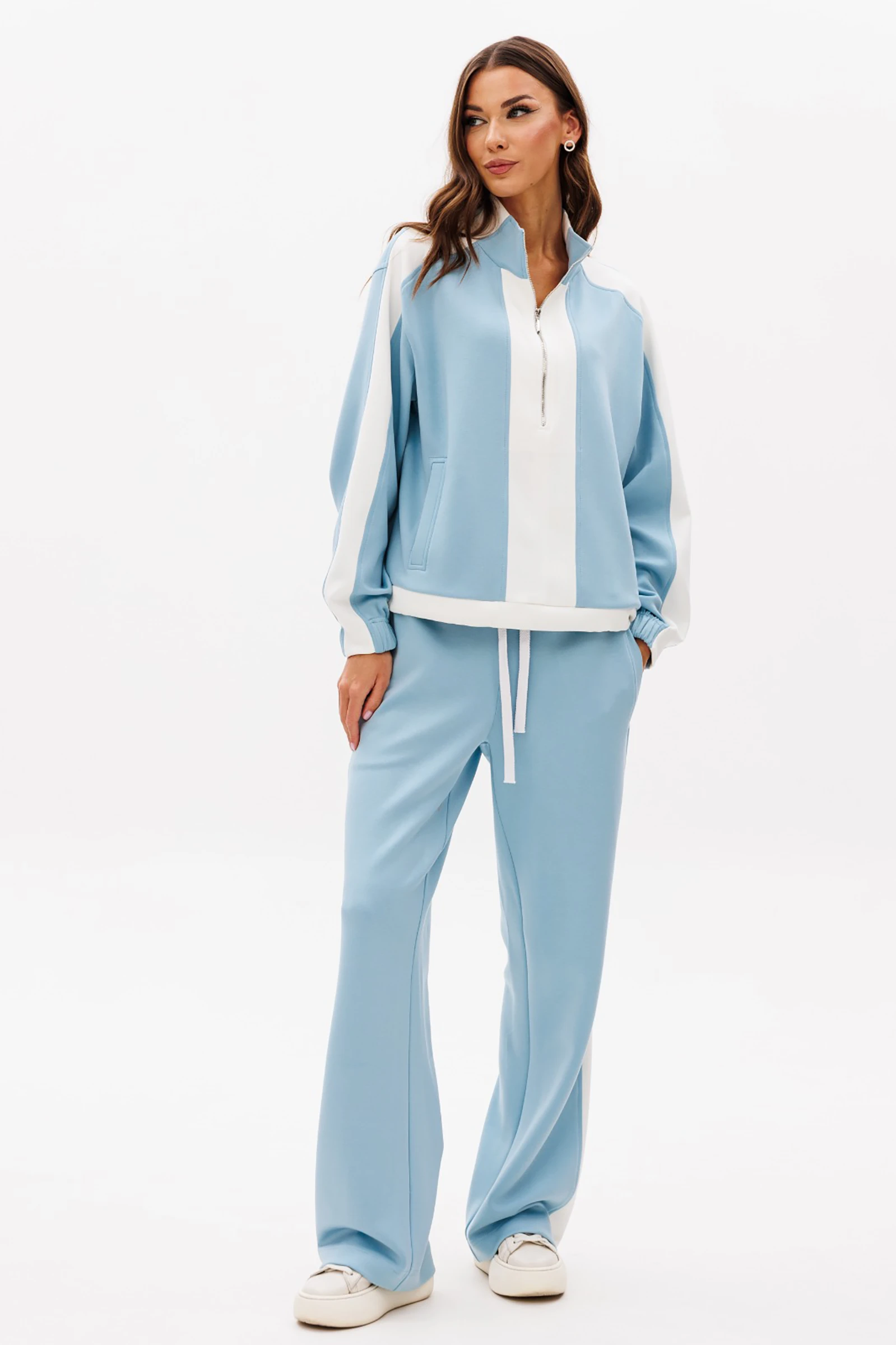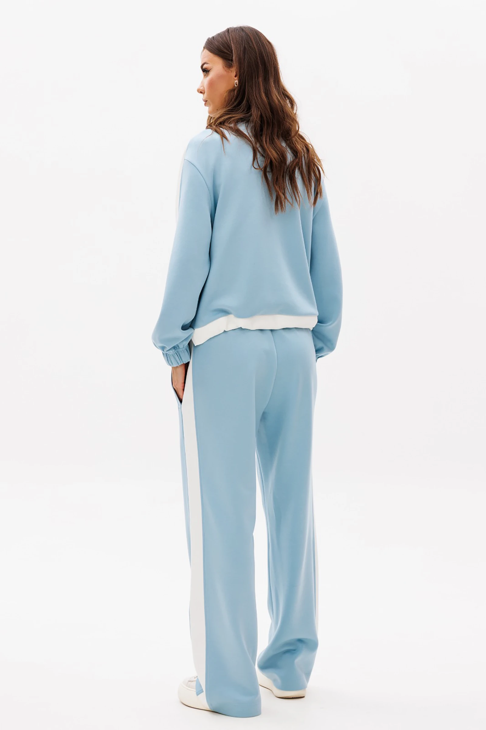 Контрастные лампасы на брюках, рукавах, по центру переда и низу придают модели особую динамичность и изысканность.