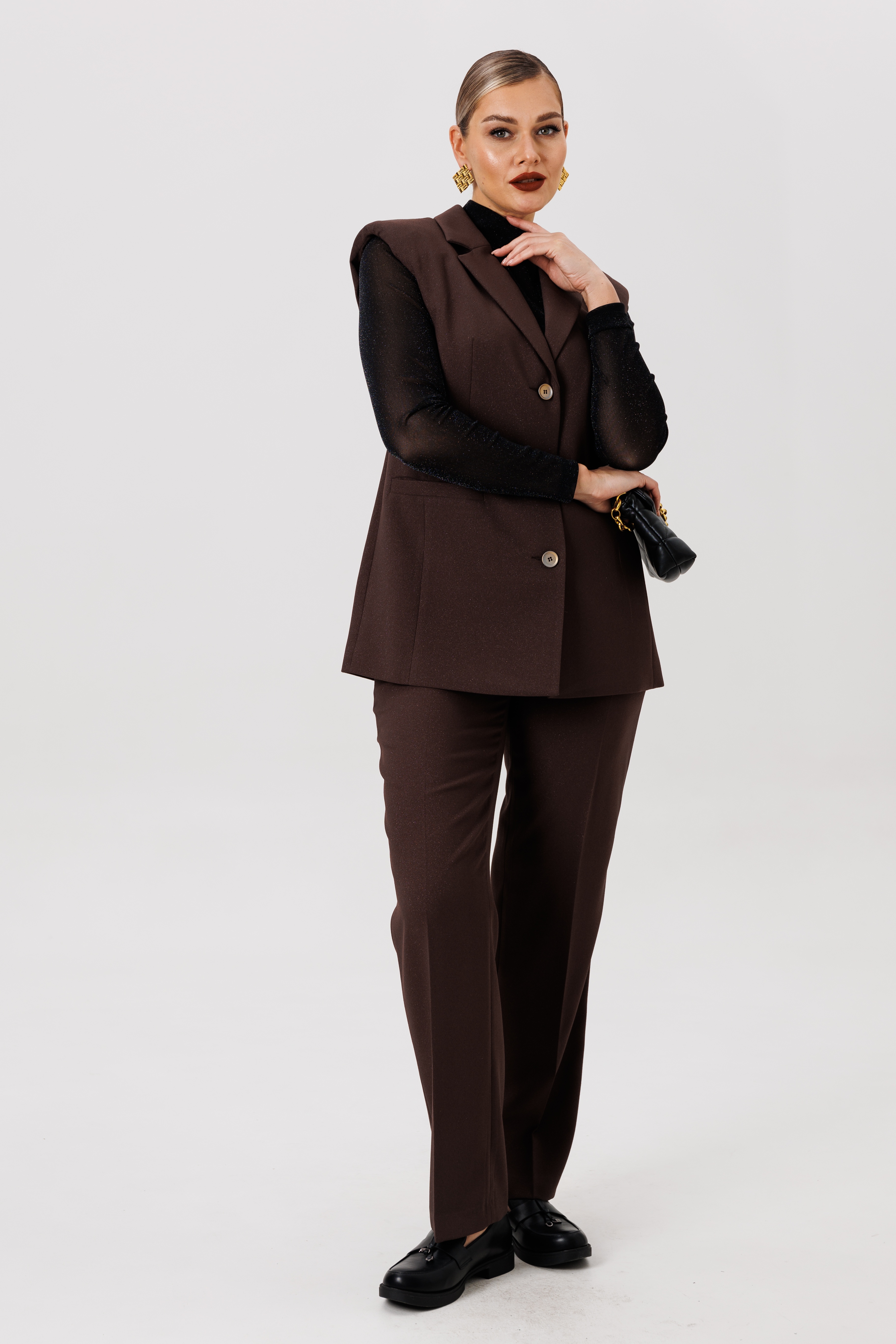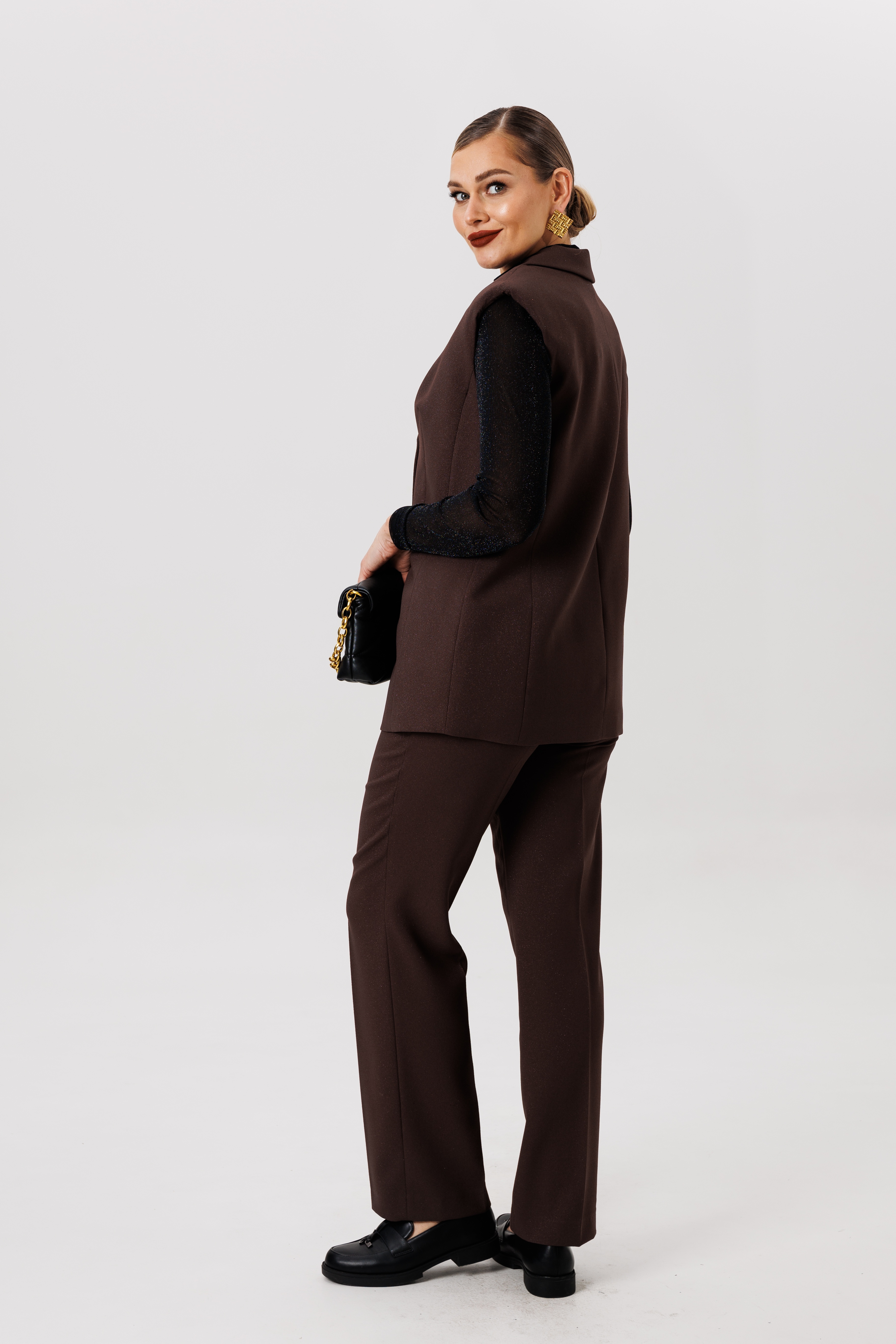 Полуприлегающий удлинённый жилет и прямые брюки отлично подчёркивают фигуру, а слегка расширенные плечи жилета придают дополнительную изюминку образу.