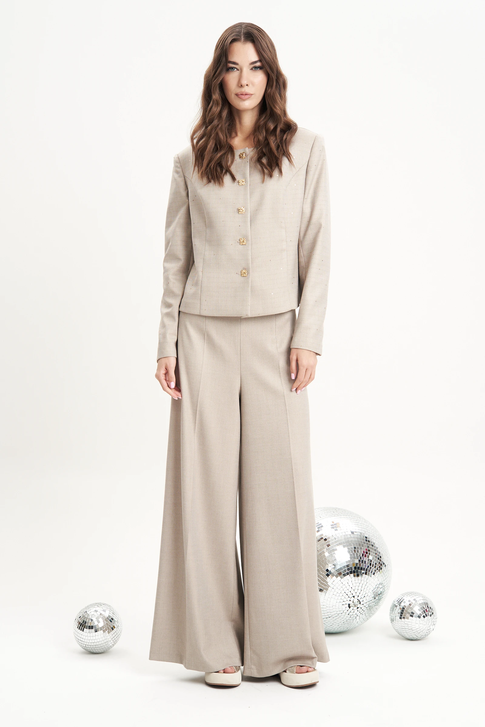 Жакет из необычного по текстуре материала с вкраплением пайетки, брюки из полотна без пайетки. Полуприлегающий силуэт пиджака с центральной застёжкой, круглым вырезом горловины и втачным покроем. Полочка с фигурным рельефом, спинка с фигурным рельефом, центральным швом и плечевыми вытачками. Рукав двухшовный.