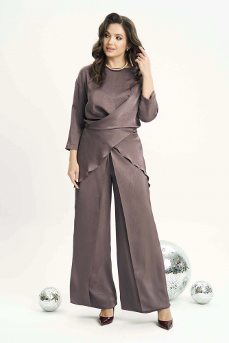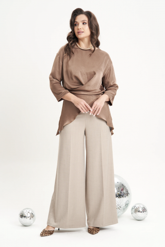 Брюки свободные, на притачном эластичном поясе в области спинки и цельнокроеном спереди. Застёжка по боковому шву на потайную молнию, петлю и пуговицу. Передние половинки брюк с отлетной деталью, оригинально драпирующейся в области талии.