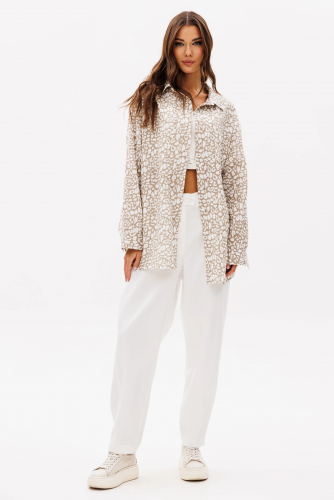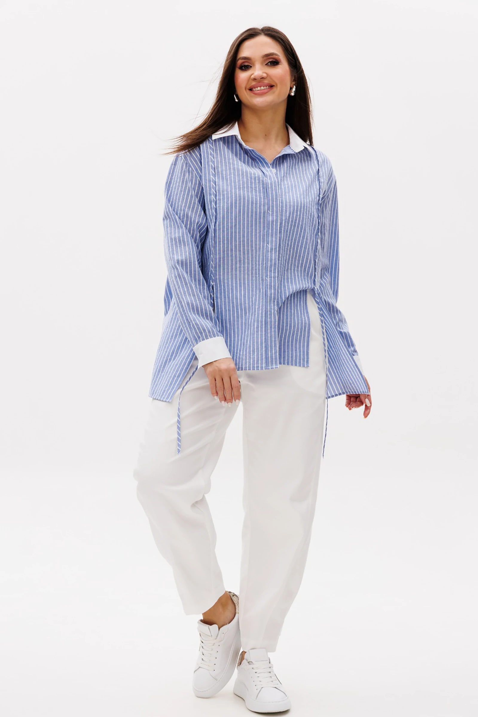 Свободный расширенный силуэт, рубашечный покрой, потайная застежка на петли и пуговицы, рубашечный рукав и воротник. Полочка с вертикальными рельефами, разрезом и отделкой под углом 45 градусов. Спинка с центральным швом с отделкой из тесьмы под углом 45 градусов.