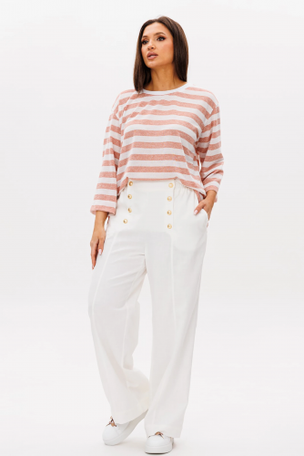 Брюки покроя "barrel", расширенные в области икры и зауженные к низу. Пояс притачной, эластичный в области спинки. По передним половинкам брюк-застежка и боковой наклонный карман. По задним-вертикальный шов. Боковой шов смещен в сторону центра передних половинок брюк. По низу-пата с регулирующими пуговицами, позволяющая создавать разную ширину брюк внизу.