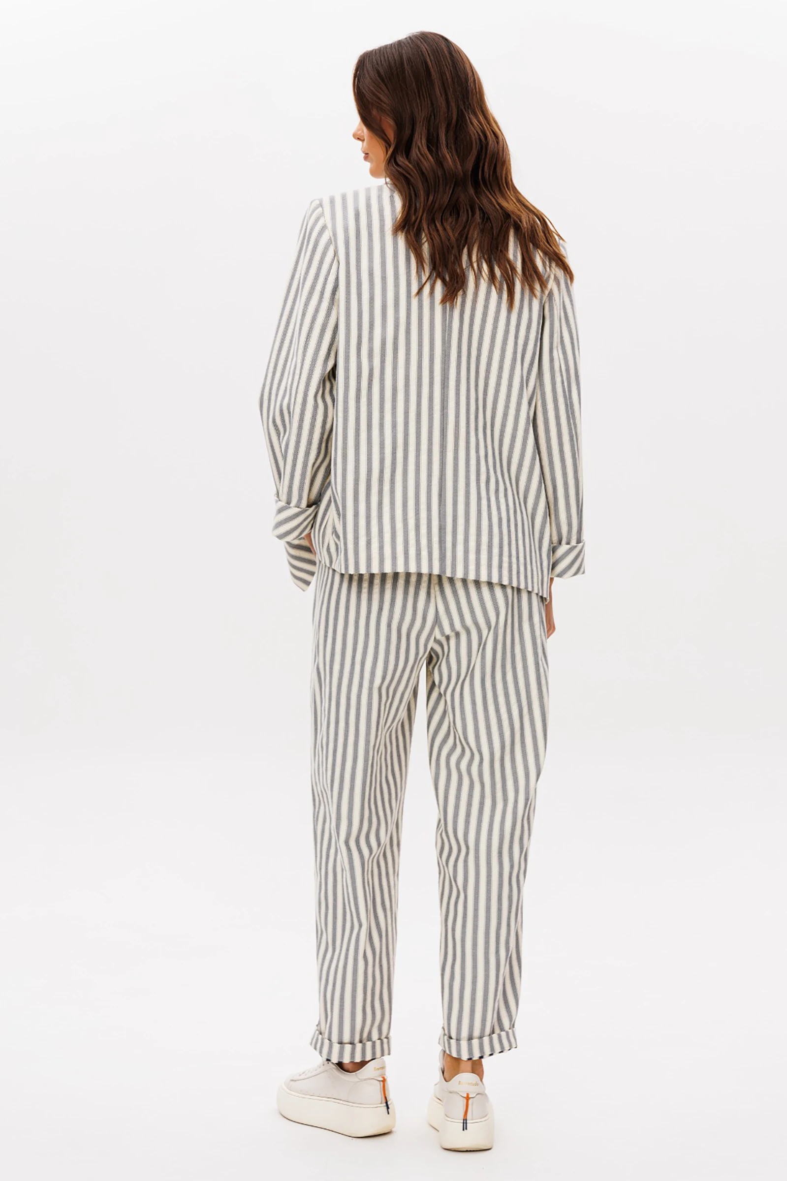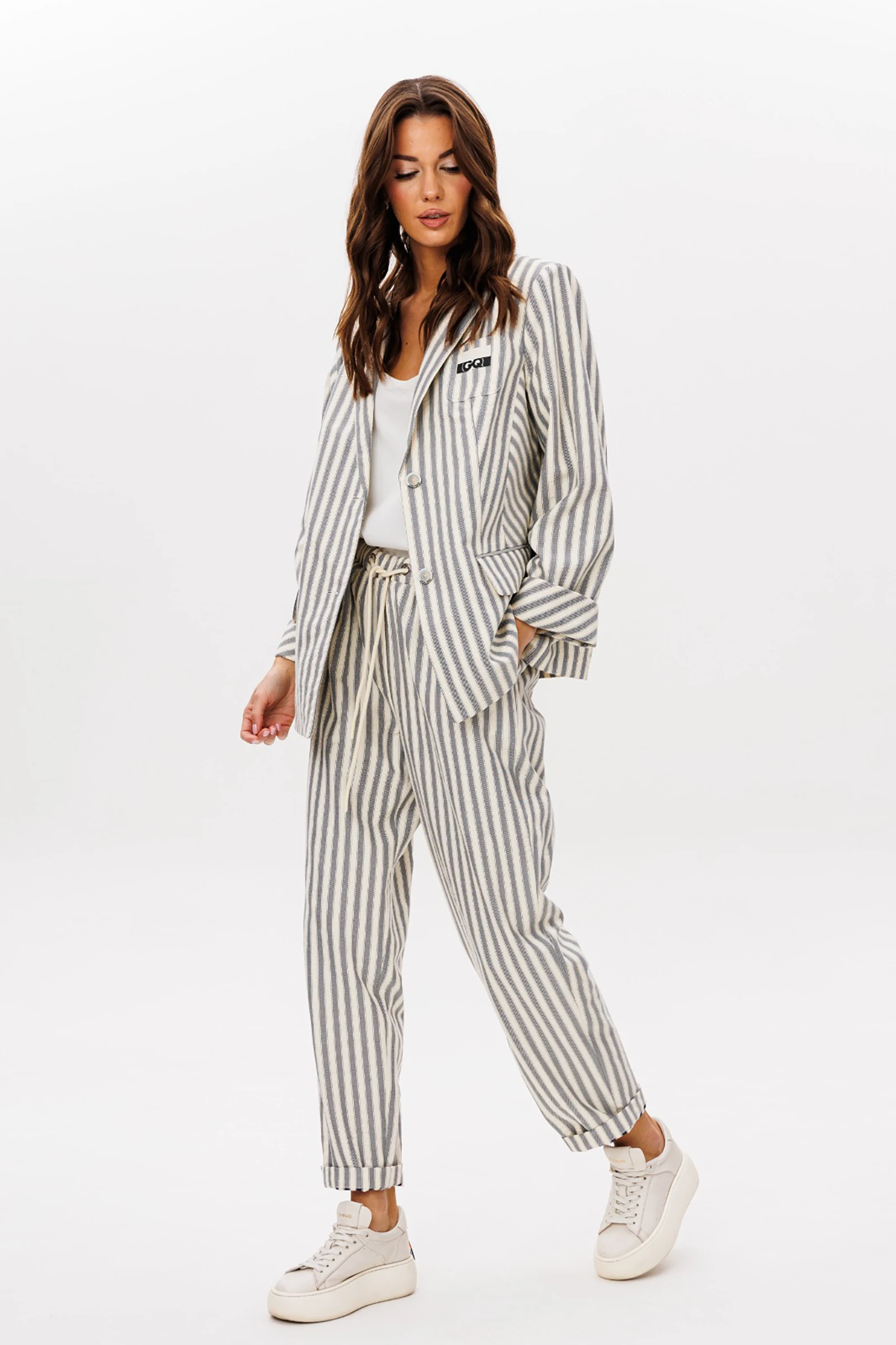 Совместимы ли официальность и комфорт, деловой или спортивный стиль? Судя по нашей модели эти противоположности отлично уживаются друг с другом. Мягкие, расслабленные брюки на резинке и свободный, упрямленный пиджак из трендовой льняной полоски - то, что подойдет вам в случае, если хочется создать комфортный образ.