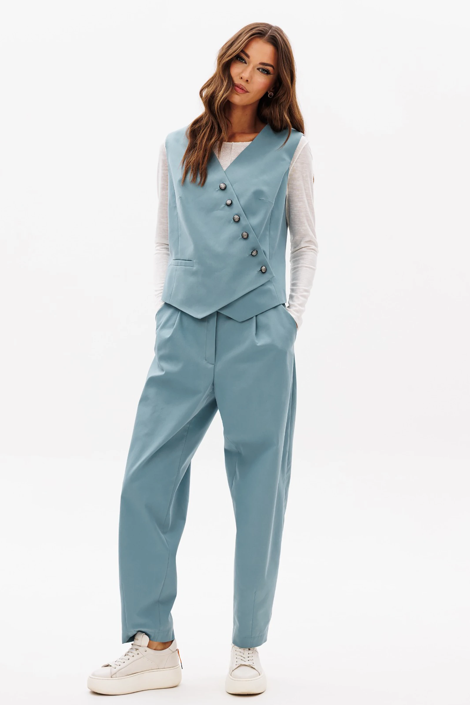 Костюм с жилетом - прекрасное решение для смелых экспериментов.  Жилет полуприлегающего силуэта с асимметричной застёжкой, фигурной линией низа и регулирующийся кулисе по спинке. Полочки с отрезным бочком и нагрудными вытачками, спинки - с центральным швом, отрезным бочком и регулирующийся кулисой с фиксаторами. Брюки "баррел" на притачном поясе со шлёвками (эластичном в области спинки), с наклонными карманами , мягкими складками защипами по верху брюк и вытачками по низу. Джемпер трикотажный, с длинным рукавом, полуприлегающего силуэта.