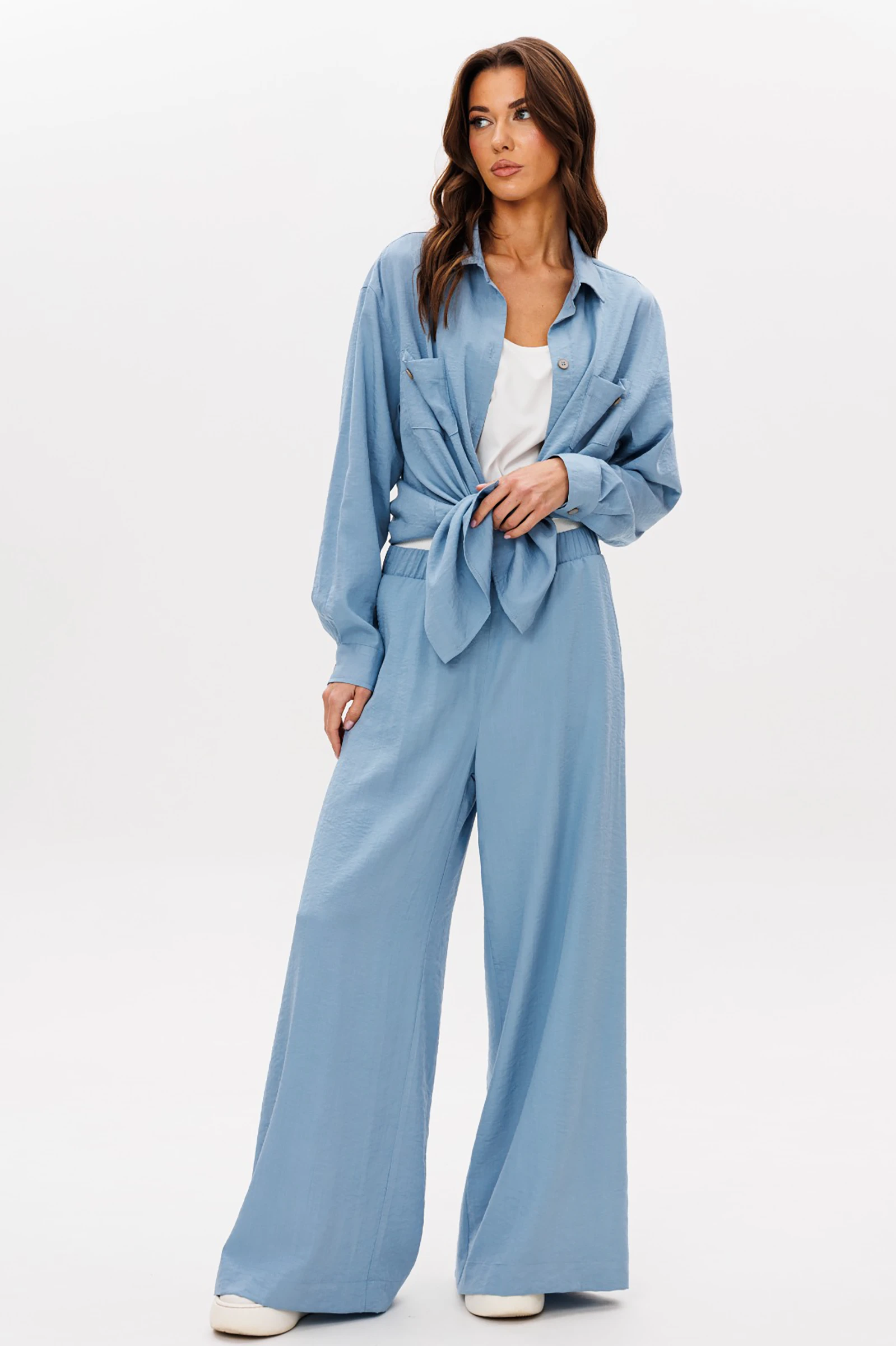 Свободная широкая рубашка и брюки-палаццо. Силуэт оверсайз, покрой рубашечный, воротник классический рубашечный с отрезной стойкой. Полочка, с отрезной кокеткой и накладными карманами. Спинка с отрезной кокеткой.